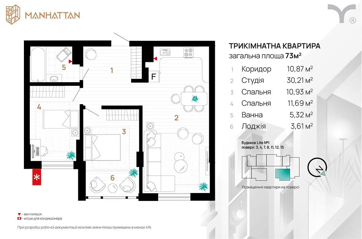 - Квартира гарного планування, заг. площею 73м2: дві окремі кімнати, лоджія в спальні, простора кухня-вітальня 30.2м2 , при вході ніша під гардеробну.