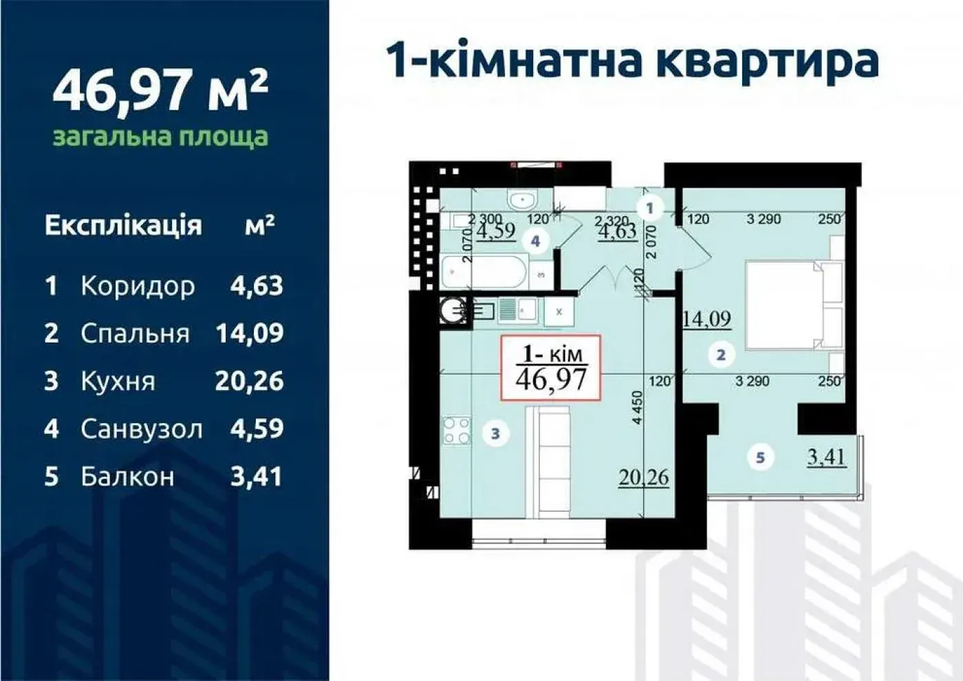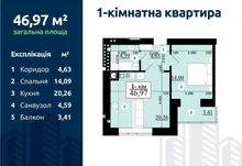 Загальна площа - 47м2 ( кухня-вітальня 20.26 м2 ).