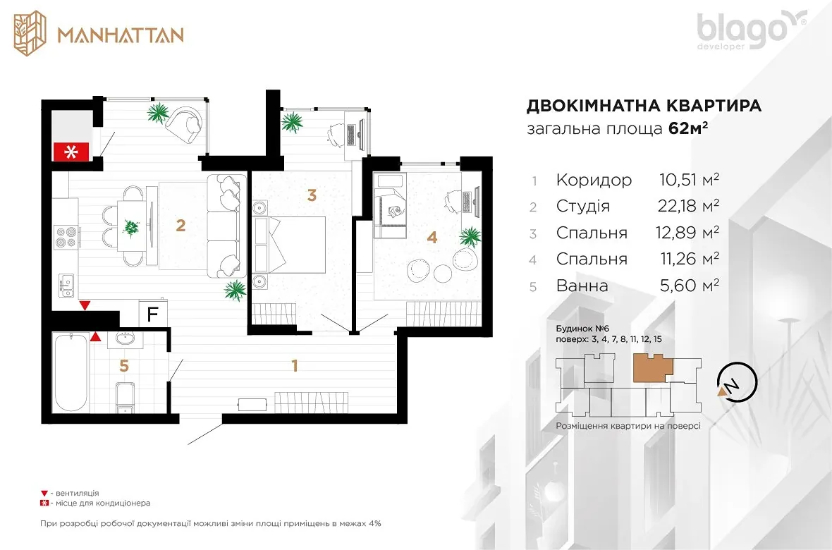 Квартира функціонального планування: простора кухня-студія 22.18м2 з просторою панорамною лоджією, дві окремі кімнати, великий санвузол, коридор.