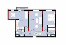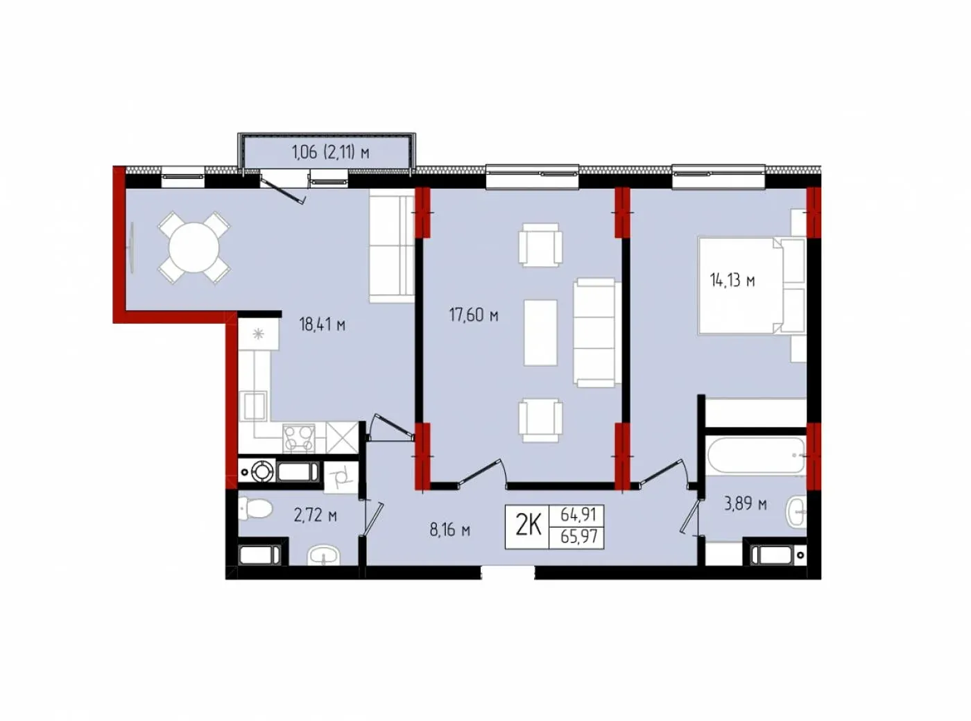 Дві окремі кімнати, простора кухня-студія 19м2 з можливістю зонування з відкритим балконом та панорамними вікнами, два санвузли.