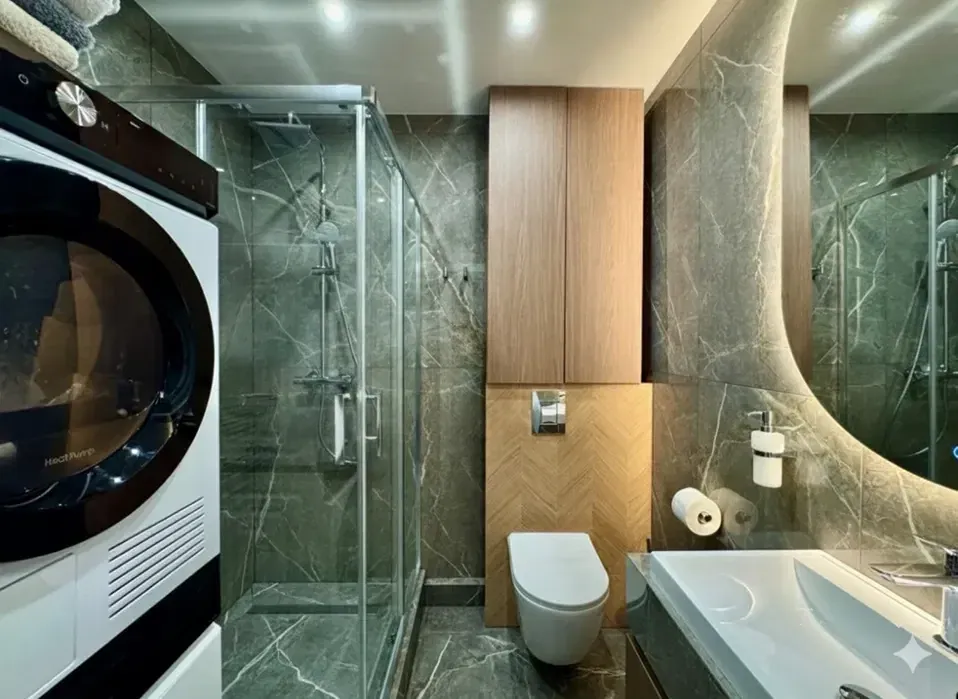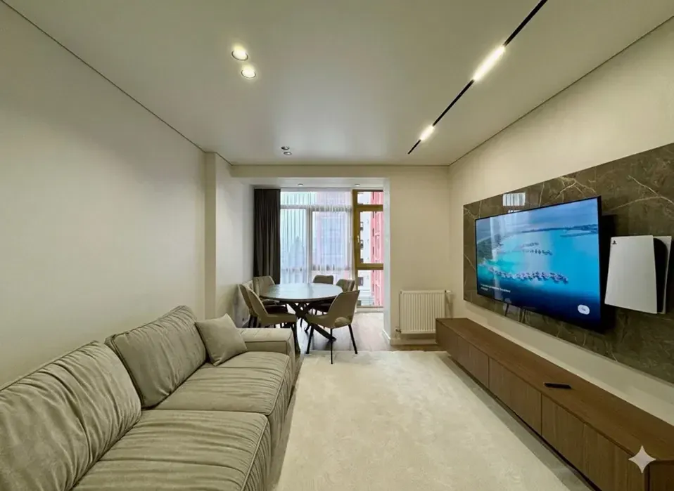 - Укомплектована всією необхідною технікою від виробників Samsung та Bocsh: вбудовані холодильник, духова шафа, мікрохвильова, газова варильна поверхня, три телевізори один на 65 дюймів MINI Led, пральна та сушка машина.