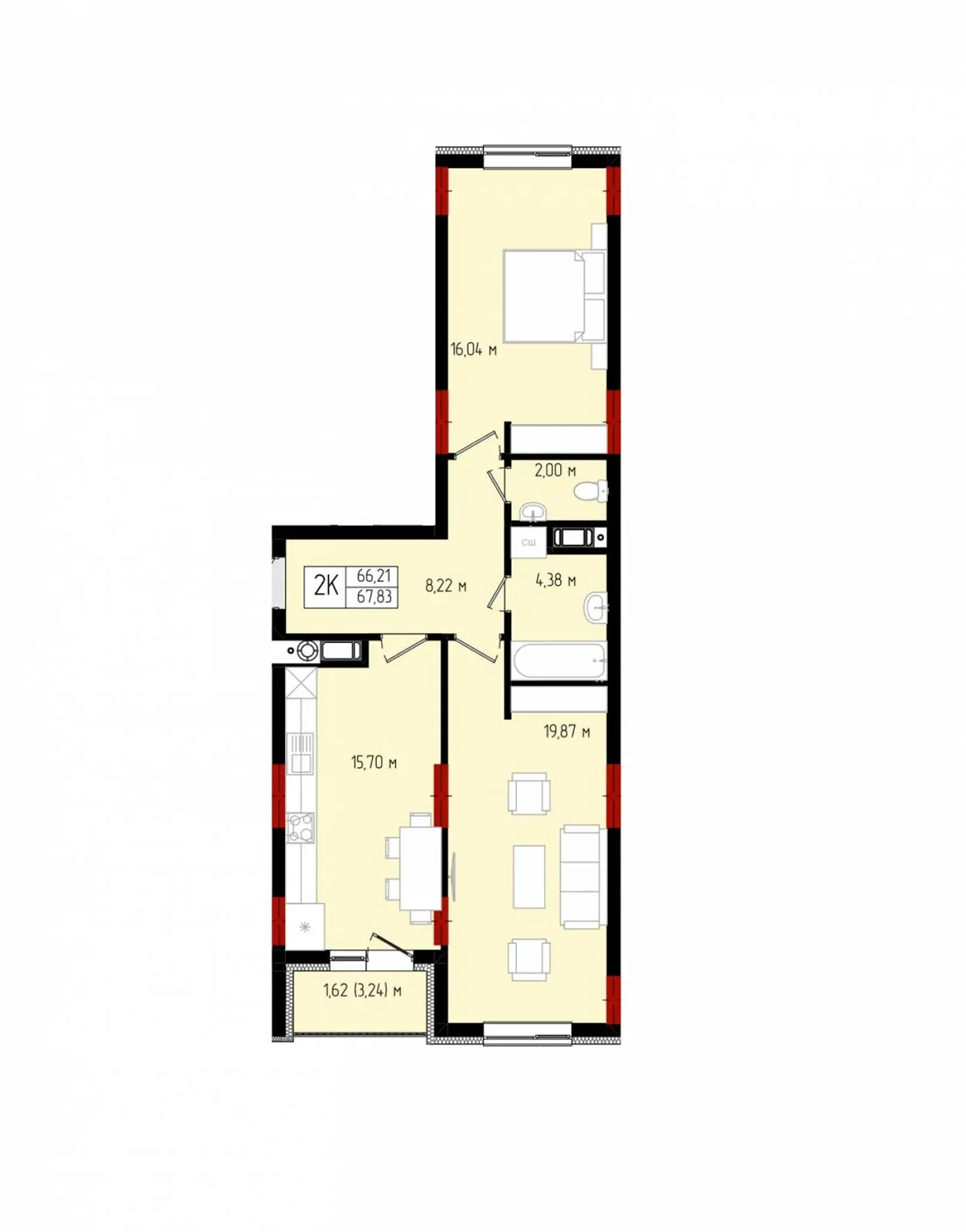 Дві окремі кімнати, простора кухня-студія 19м2 з можливістю зонування з відкритим балконом та панорамними вікнами, два санвузли.