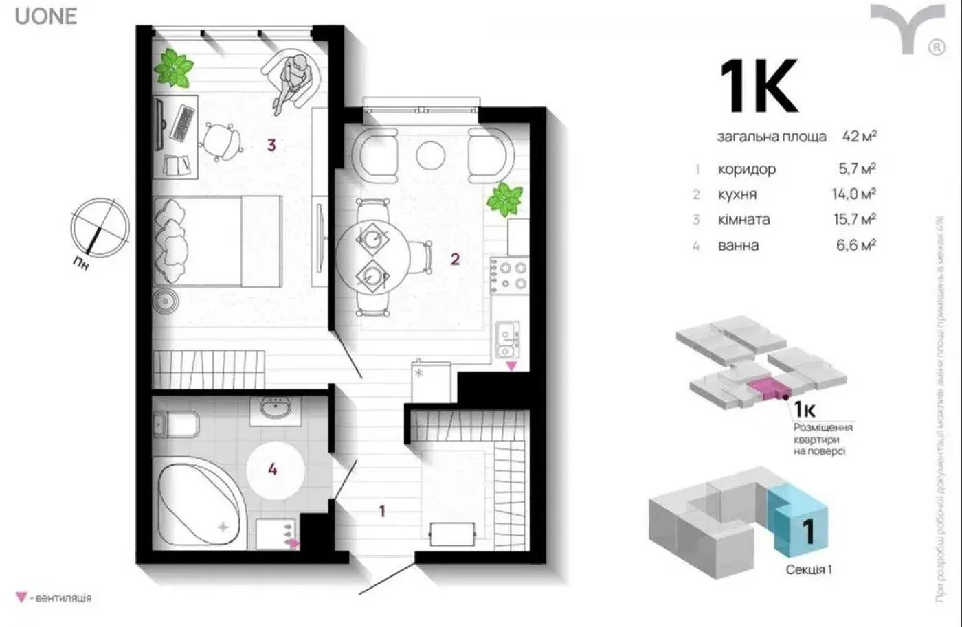 Планування: окрема кімната з панорамними вікнами, простора кухня 14м2, санвузол, окрема гардеробна.