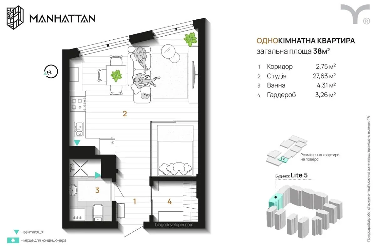 Пропонується до продажу сучасна 1-кімнатна квартира в престижному житловому комплексі Manhattan.