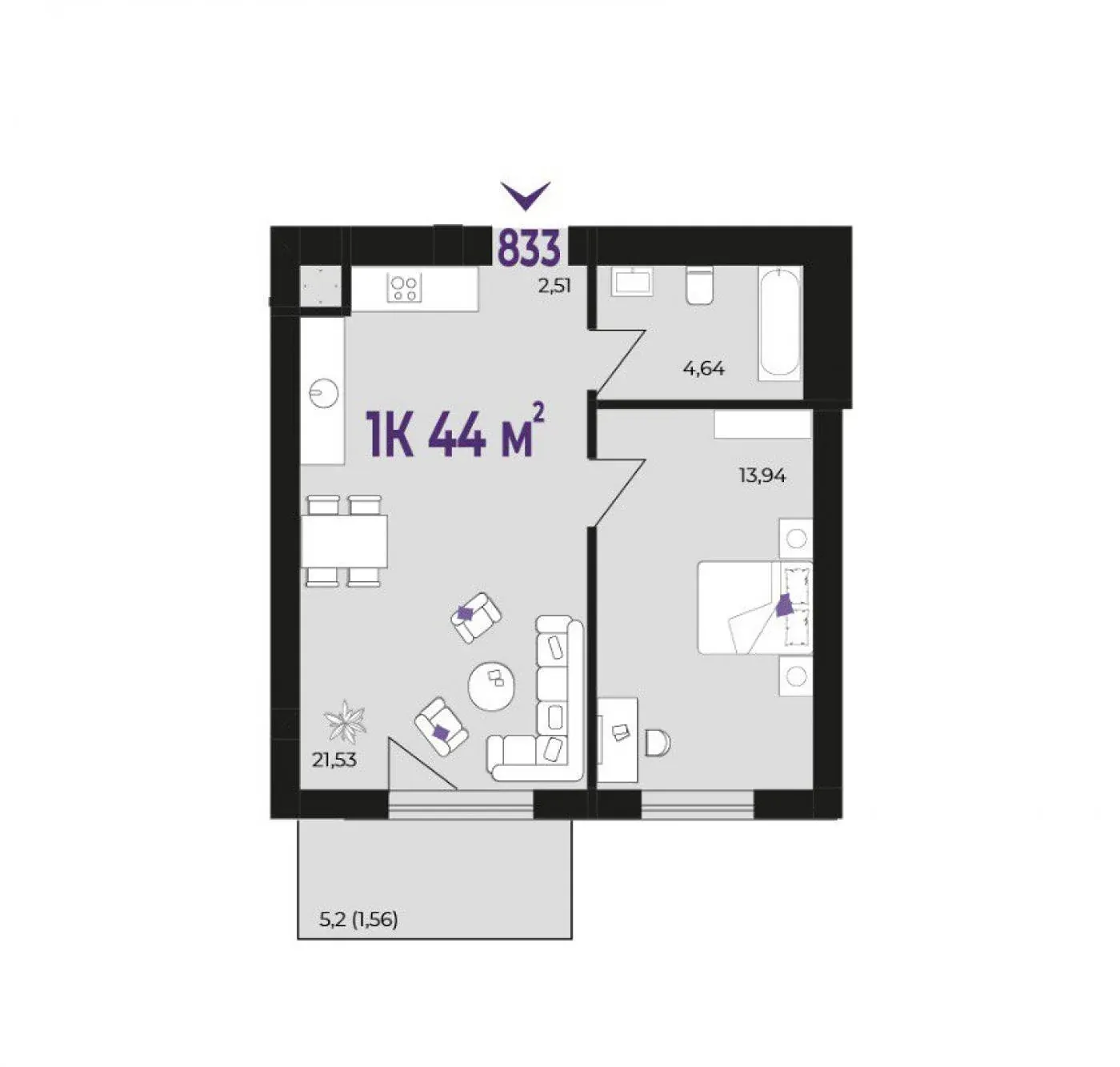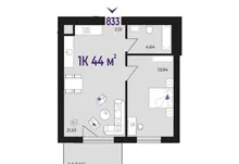 Квартира функціонального планування, площею 44 м2 : окрема кімната, простора кухня-вітальня 21.5 м2 з великим балконом 5.2 м2.