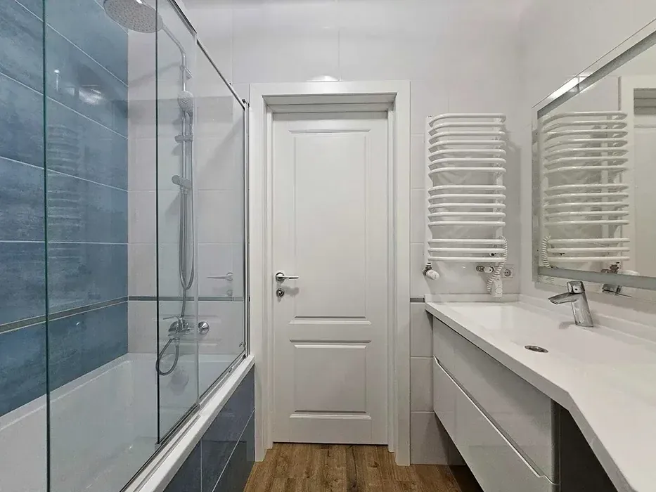 - Велике дзеркало у ванній на всю стіну з підсвіткою.