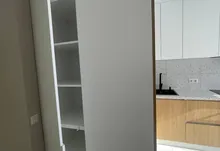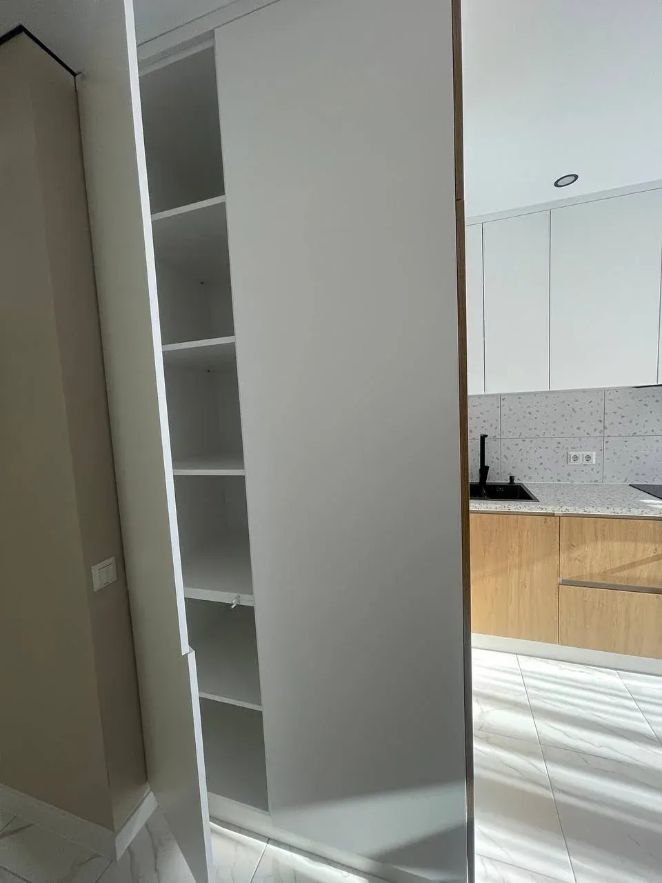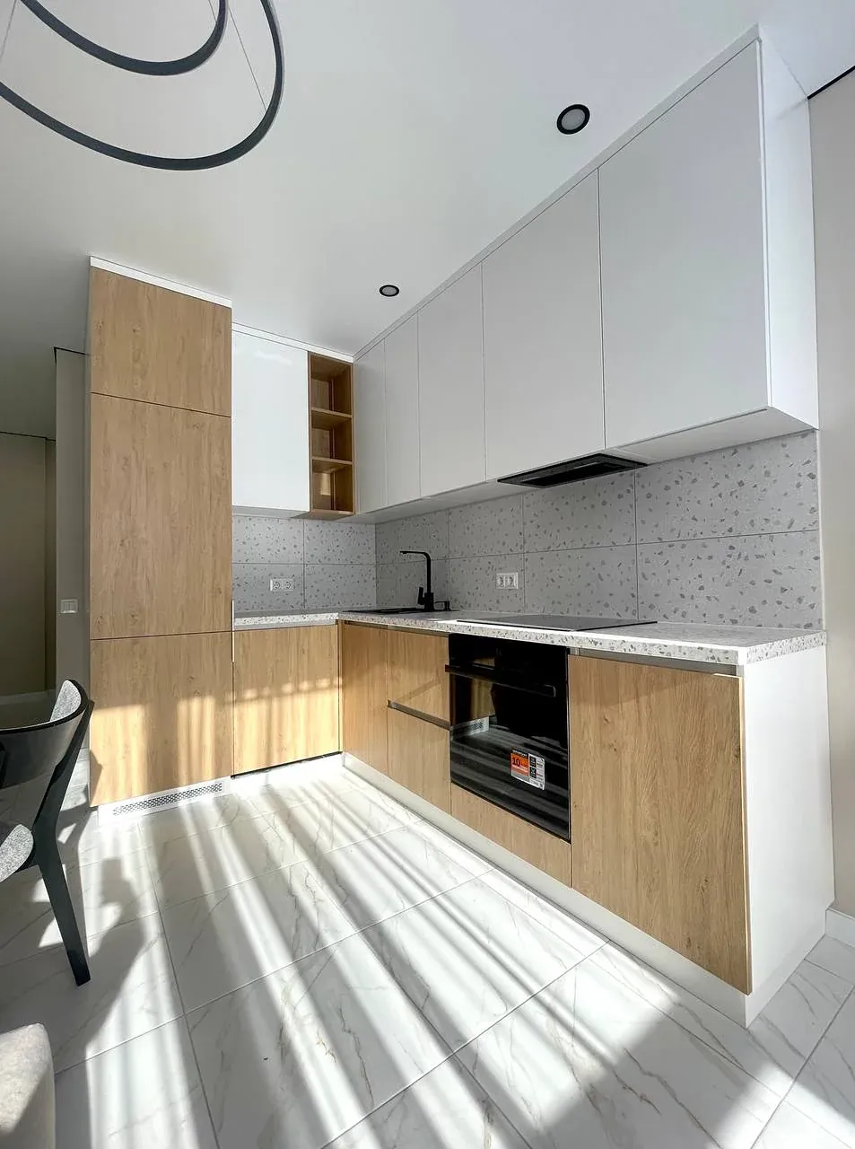 Інтерʼєр продуманий до деталей: простір використано максимально ефективно, передбачено багато місць для зберігання, що робить квартиру не тільки красивою, а й дуже функціональною.