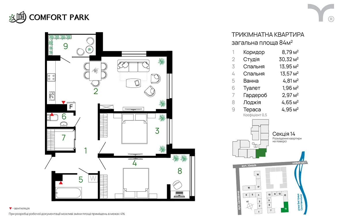 Простора студія з вітальнею з виходом на балкон 5 м2, дві окремі кімнати з лоджією, гардеробна, пральня.