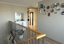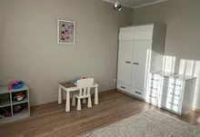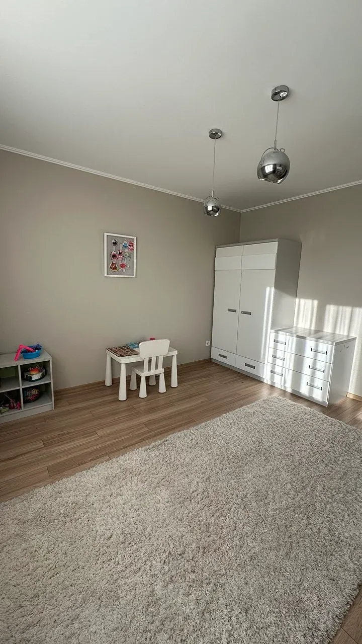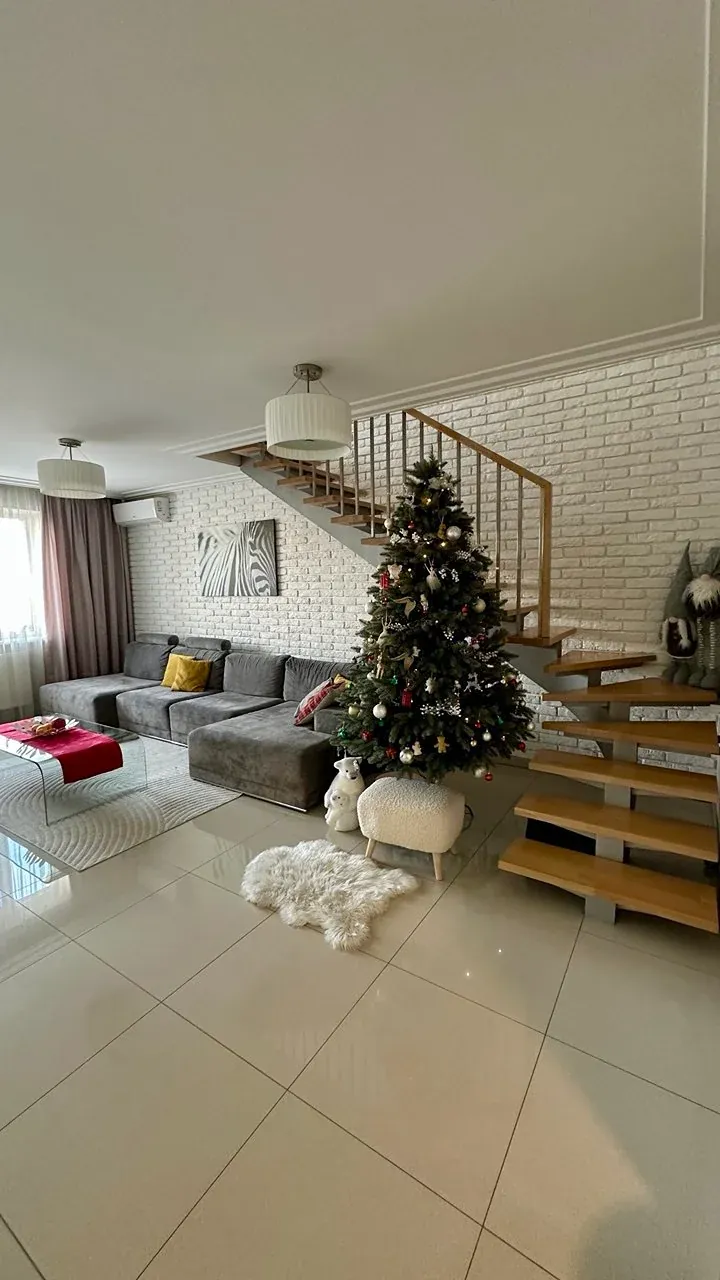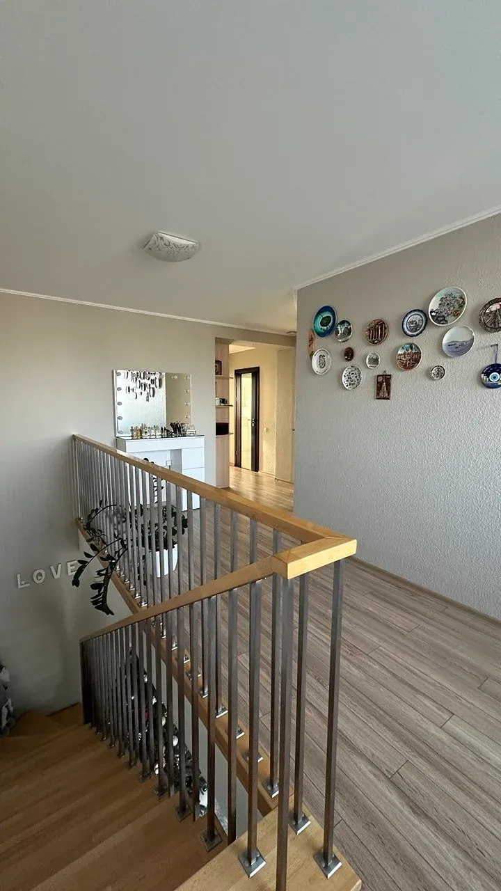 Другий рівень — більш приватна частина квартири. Тут облаштована комфортна зона відпочинку, де можна проводити вечори у колі сімʼї. Також розташована простора батьківська спальня з заскленим балконом, окрема дитяча кімната та велика ванна кімната.