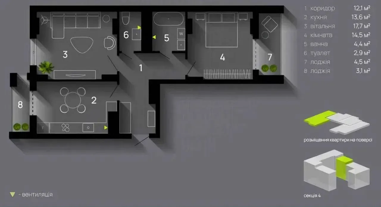 Квартира функціонального планування : дві окремі кімнати (простора вітальня та спальня з панорамною лоджією, кухня з лоджією, два санвузли.