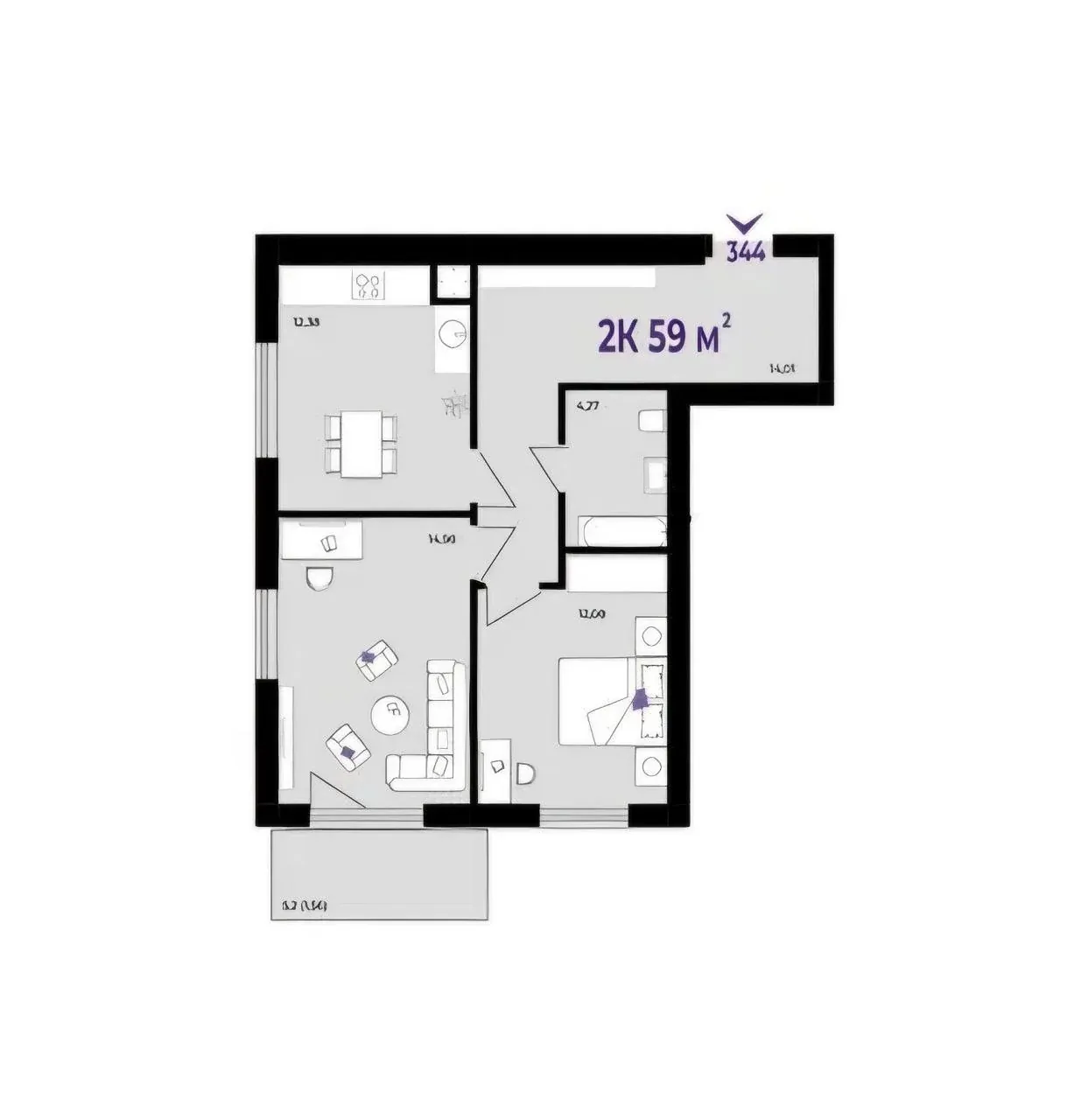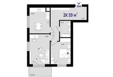 Квартира функціонального планування, 59м2 : дві окрема кімната, кухня12.3м2, просторий санвузол, та балкон з кімнати 5.2м2.
