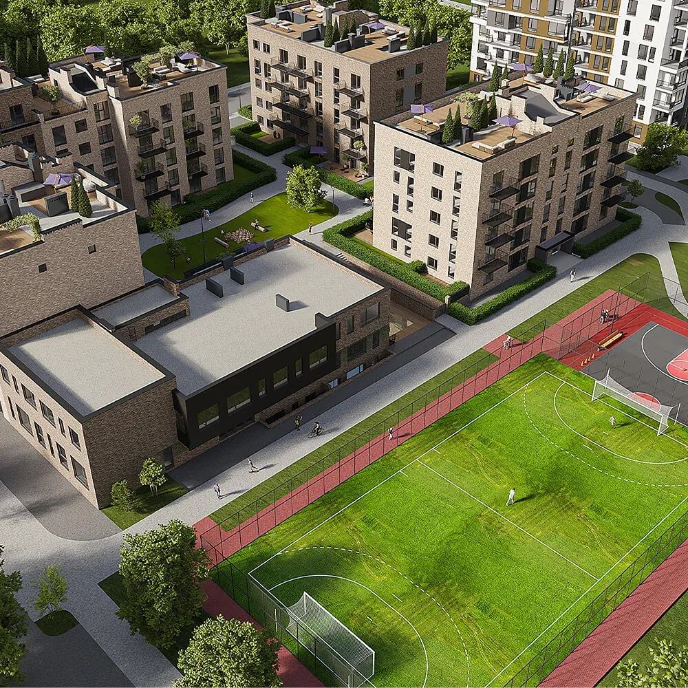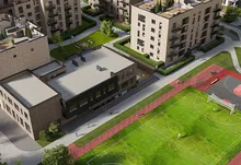 На території дитячі та спортивні майданчики, спортивне поле, приватна школа на території ЖК.