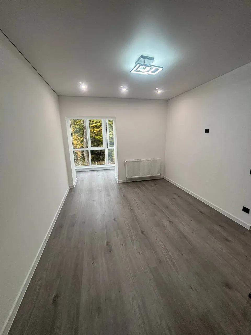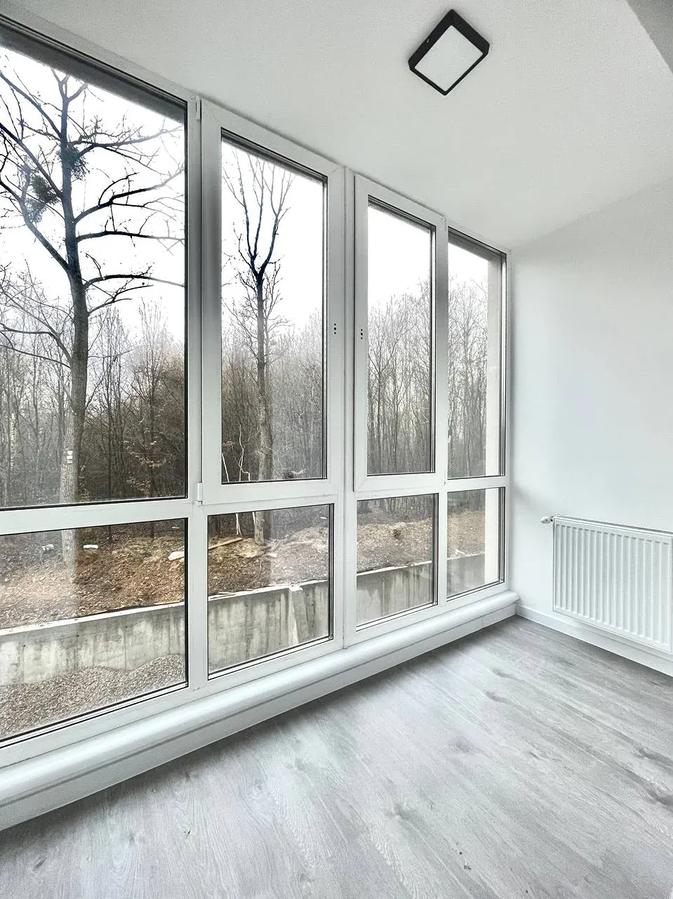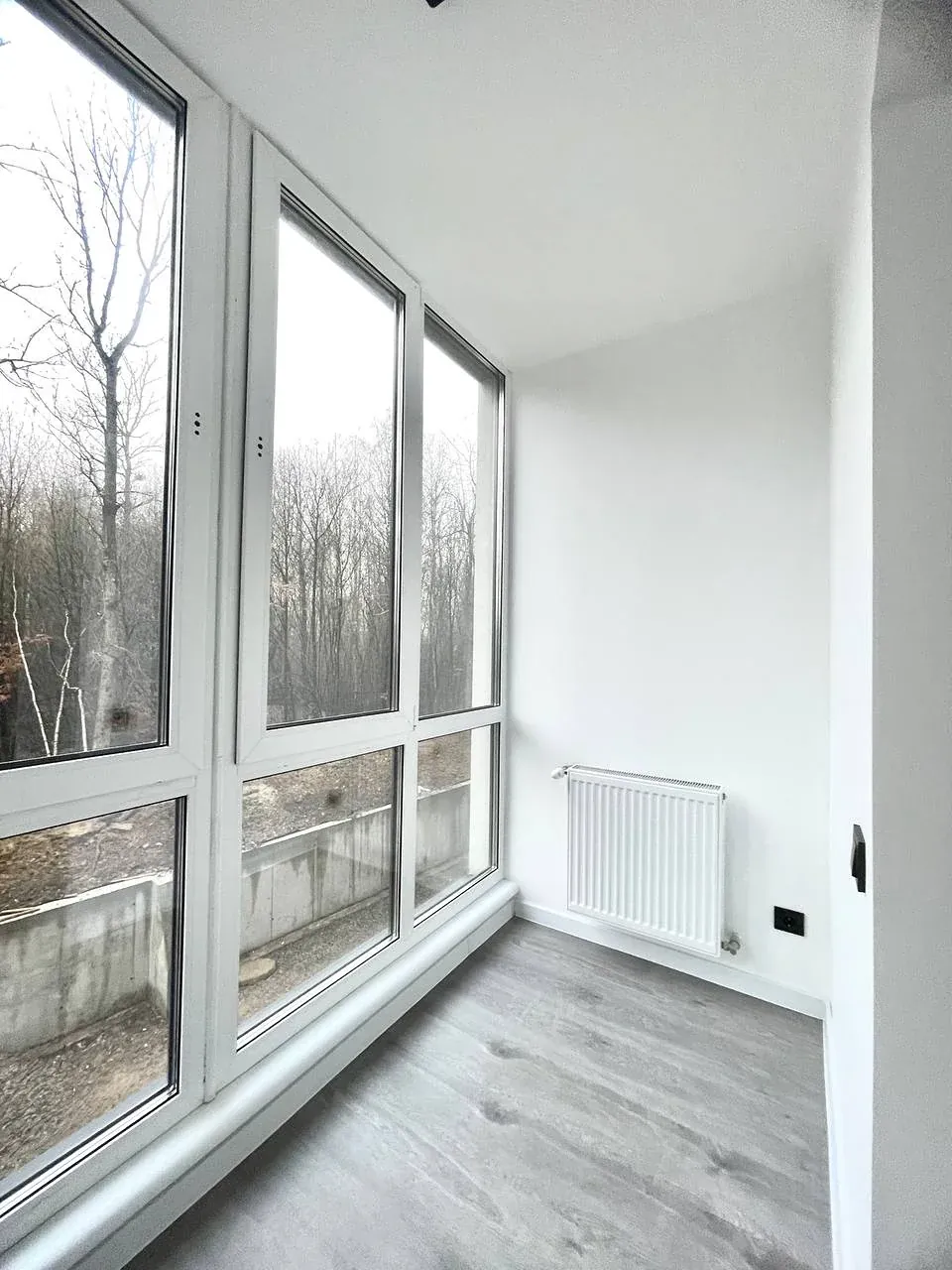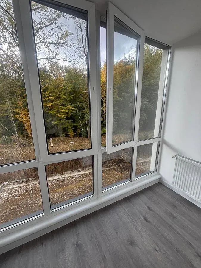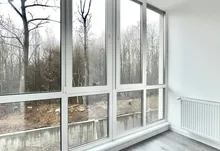 Простора кімната з великим вікном, лоджією та видом на зелену зоною
