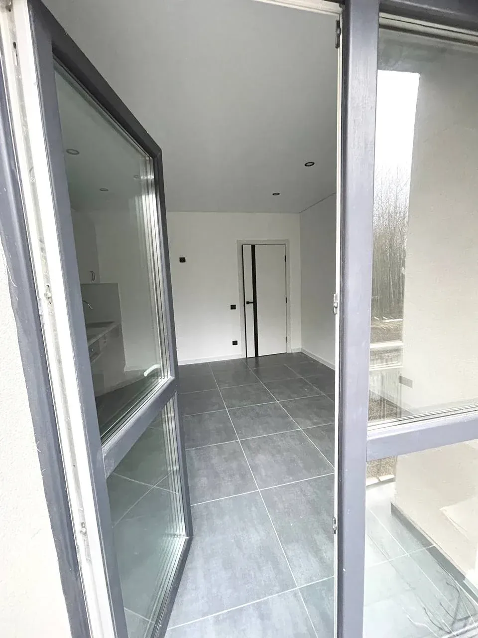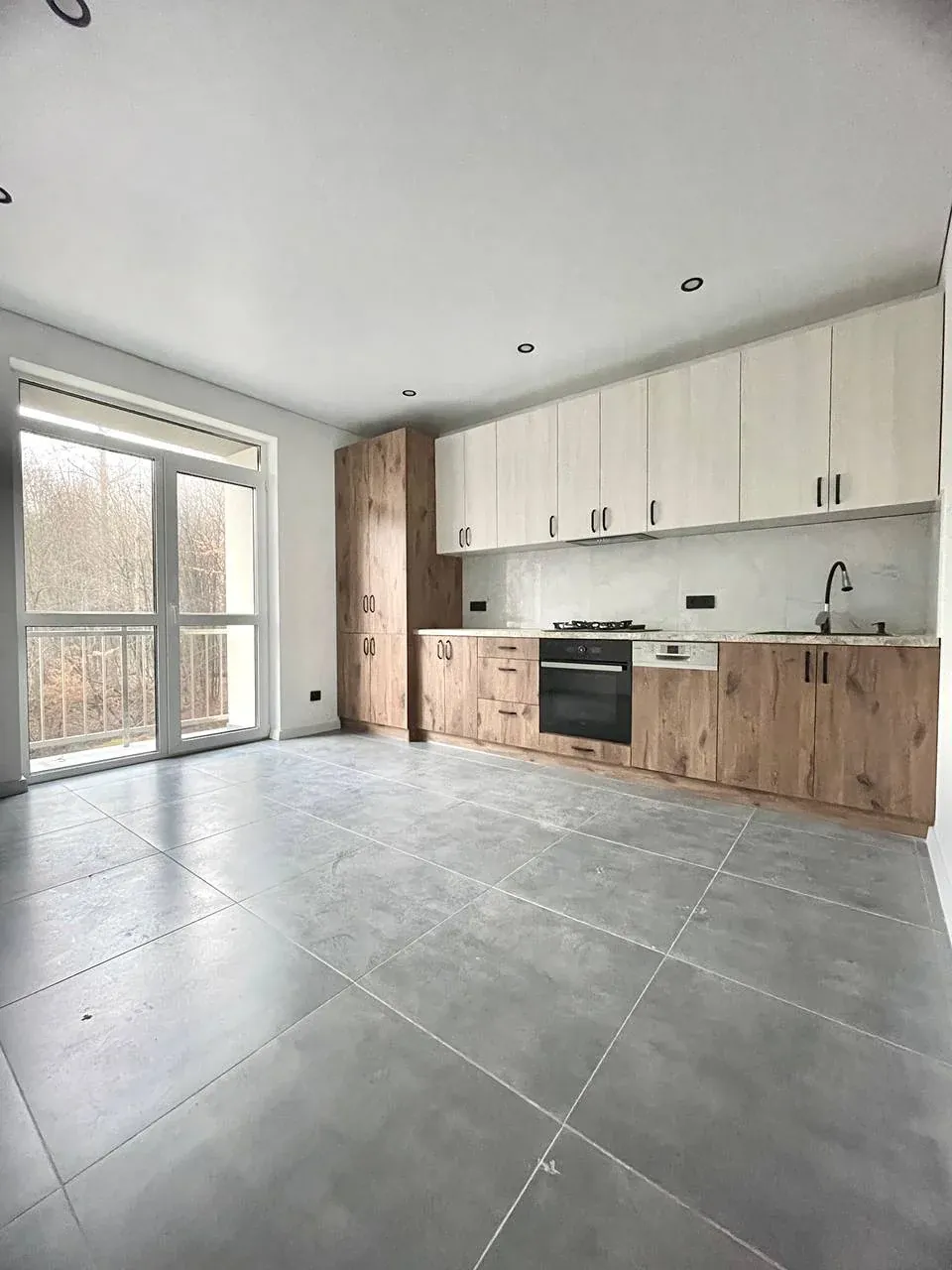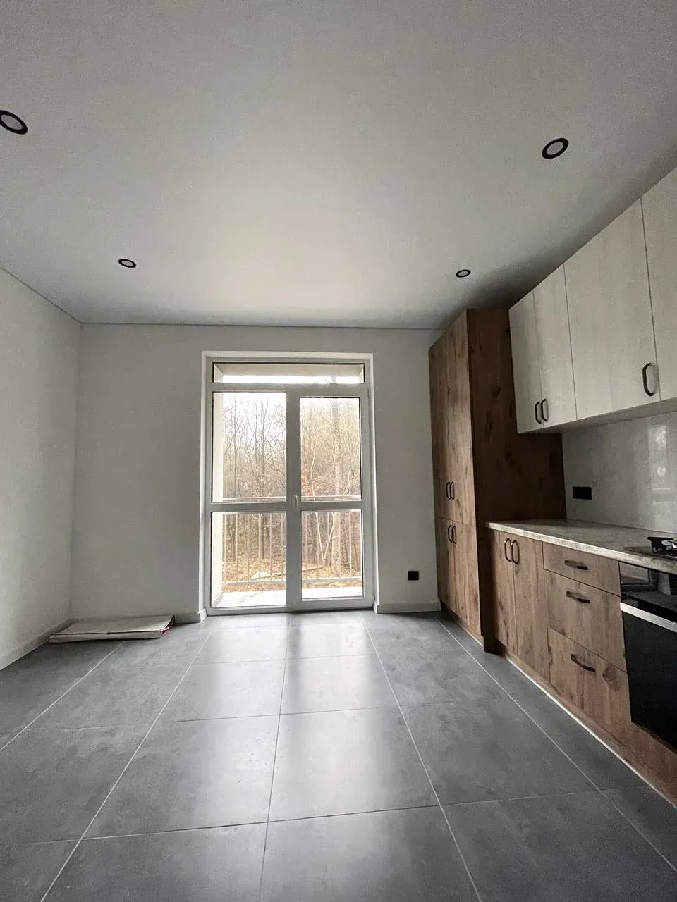Простора кімната з великим вікном, лоджією та видом на зелену зоною