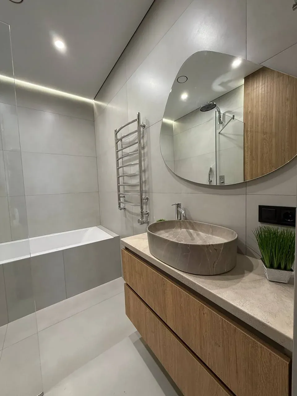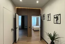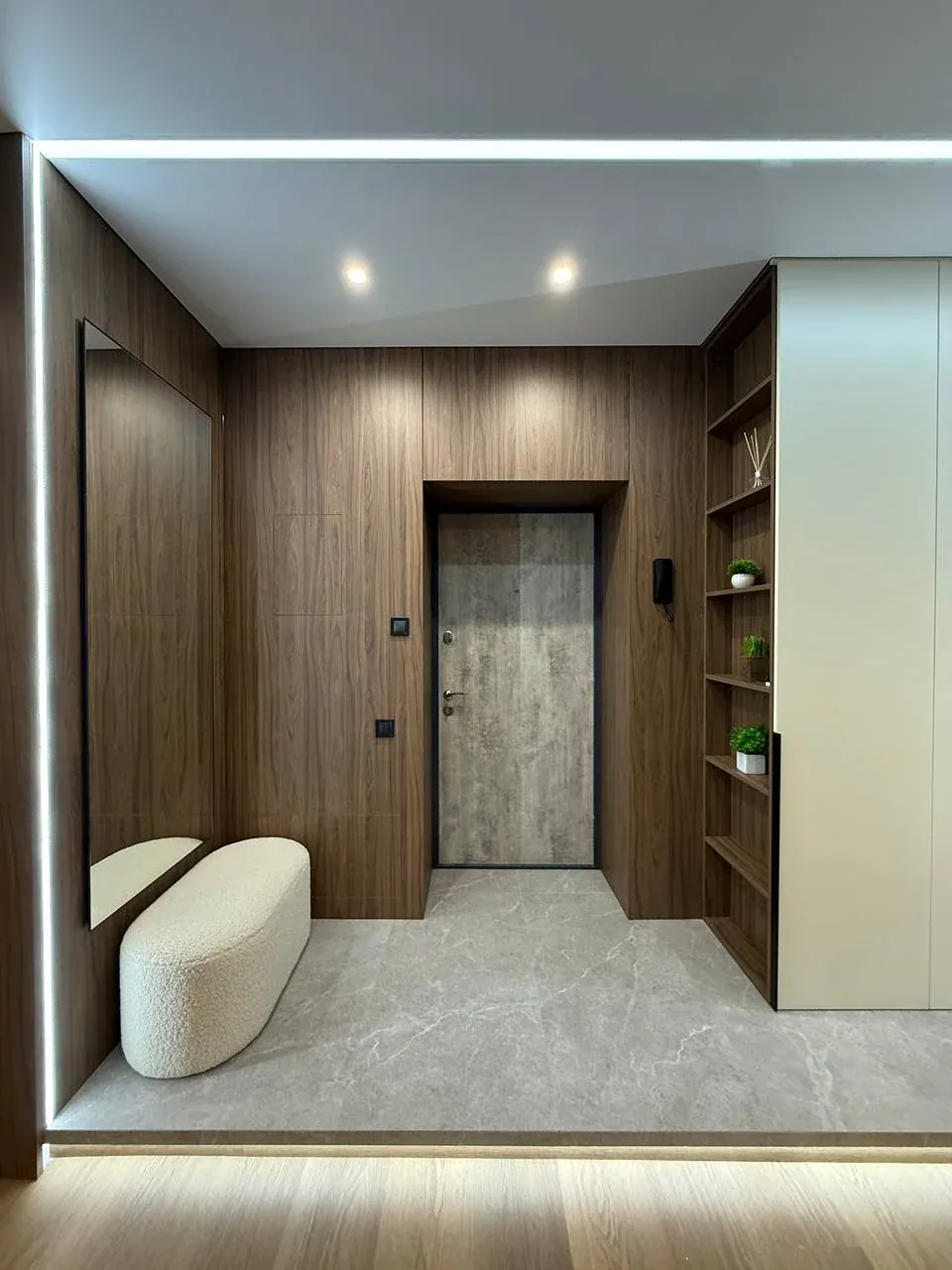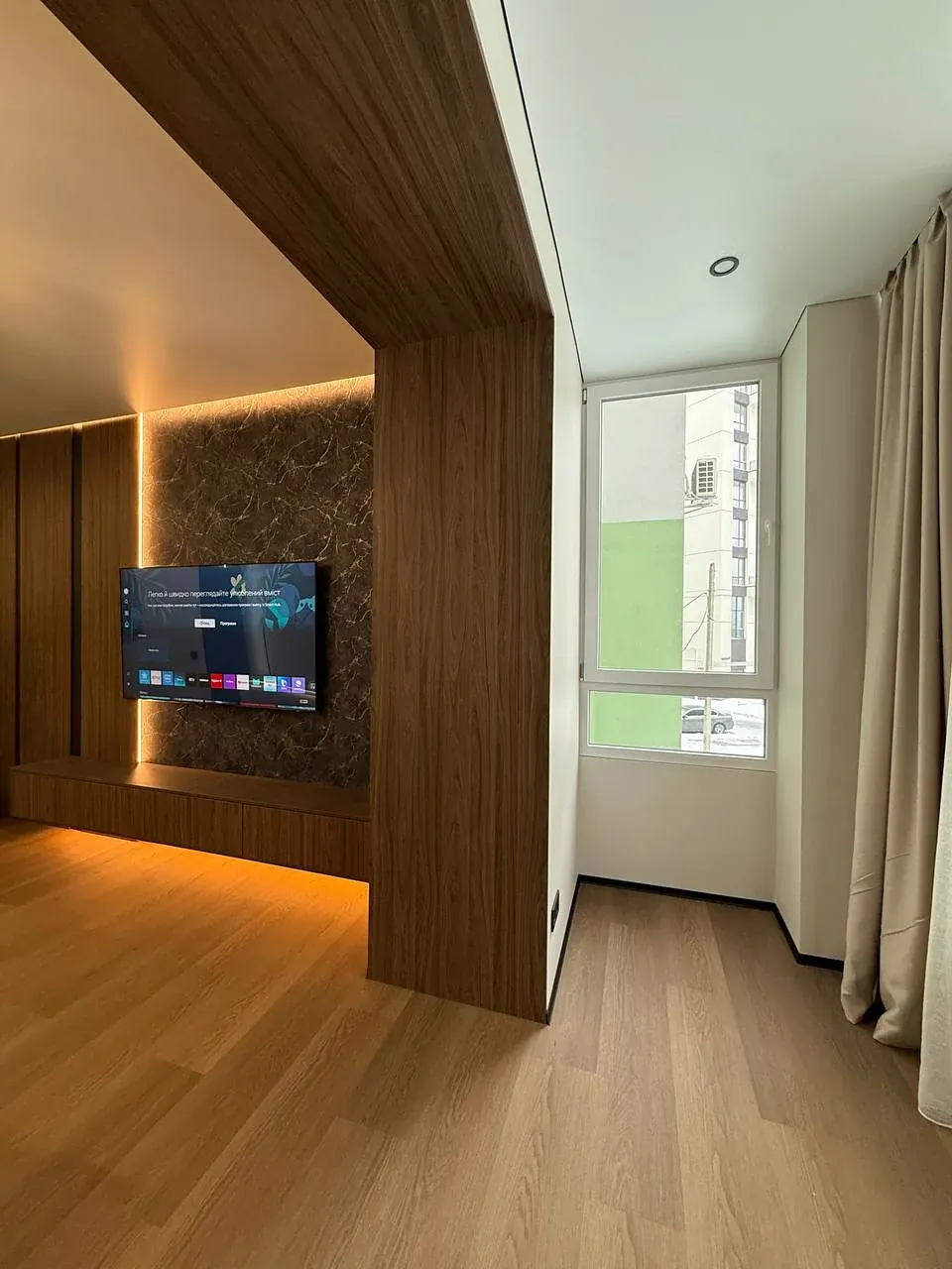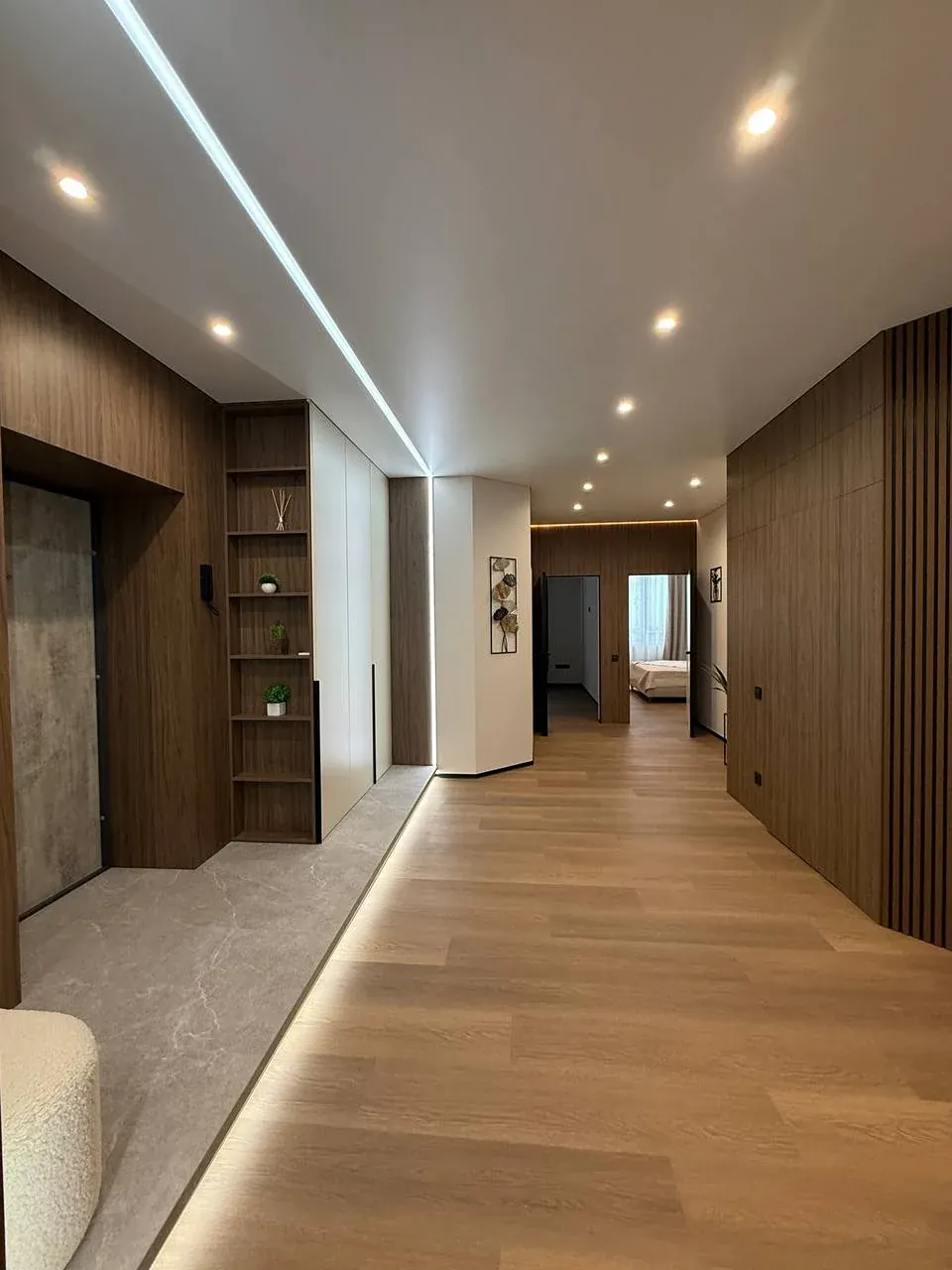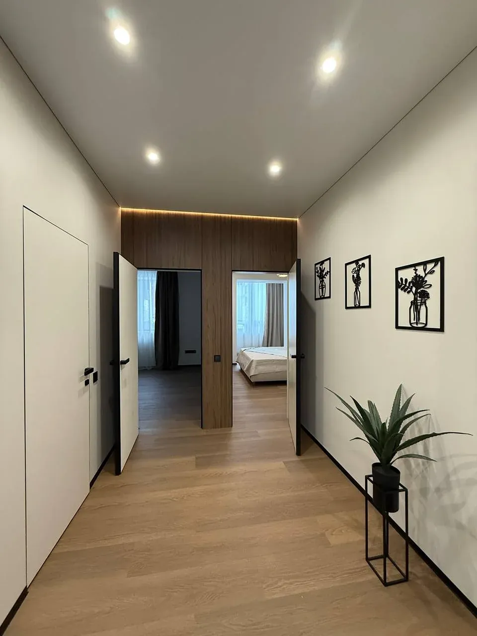 Інтерʼєр доповнюють алюмінієві плінтуси, двері прихованого монтажу, стильні сучасні рішення та якісна фурнітура.