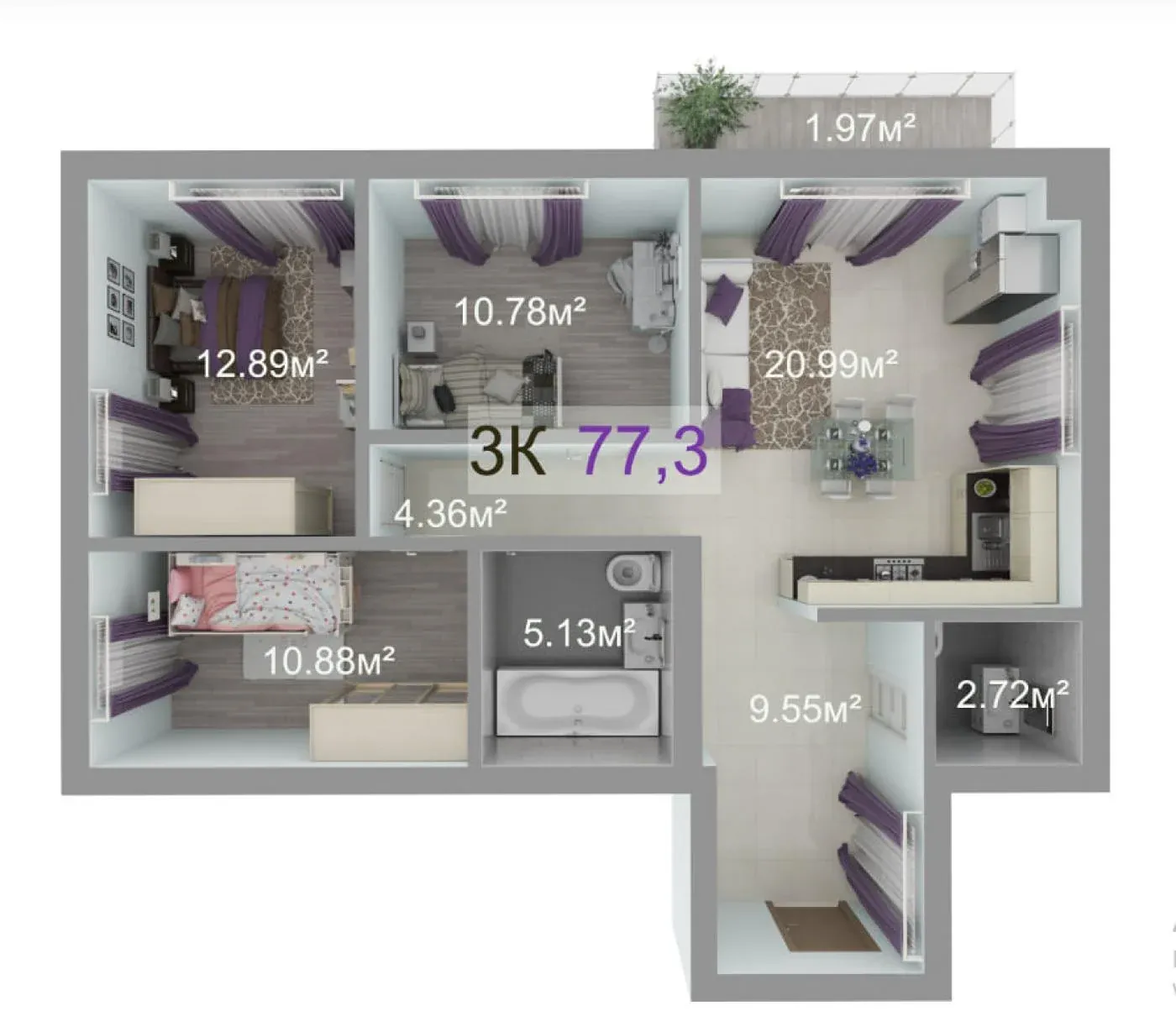 • три окремі кімнати — ідеально для сімʼї або комфортного зонування;