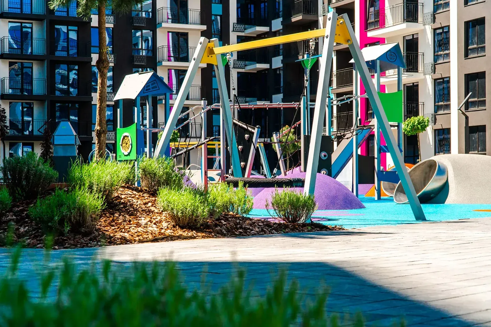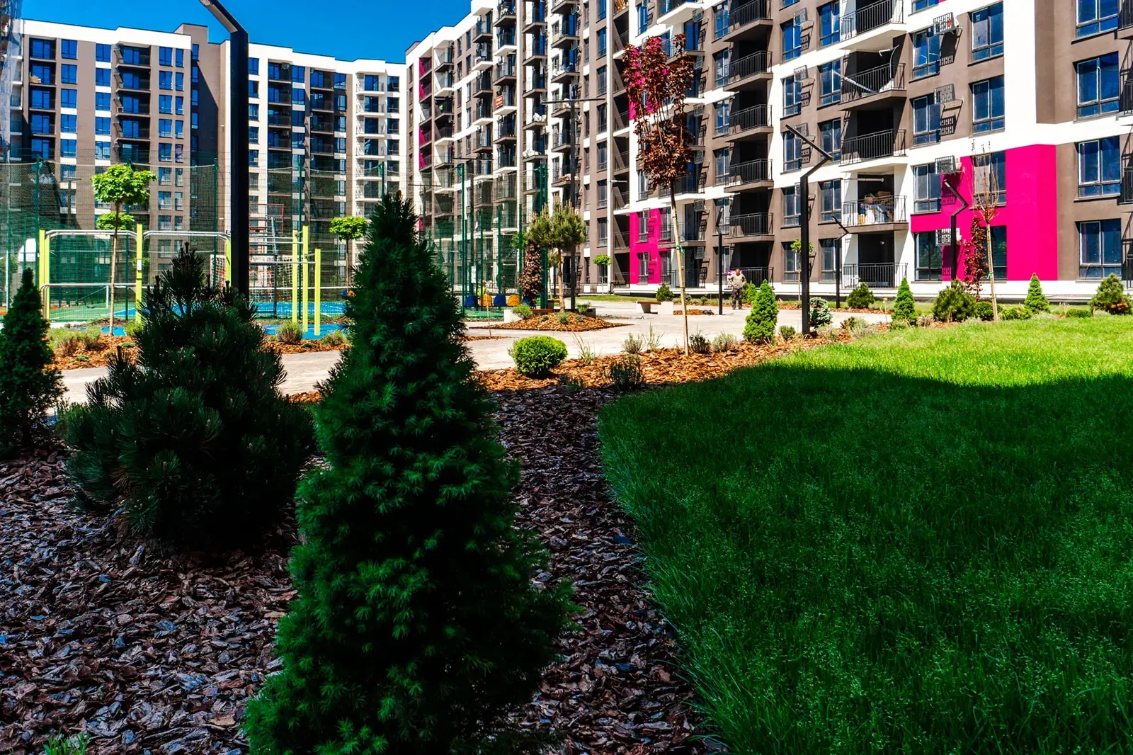 Великий внутрішній двір з дитячими, спортивними майданчиками, ландшафтним дизайном та відпочинковими зонами.