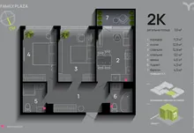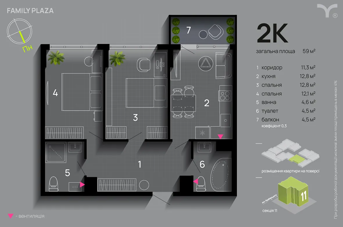 - функціональне планування, дві окремі кімнати, два санвузла, кухня з виходом на балкон-терасу 4м2