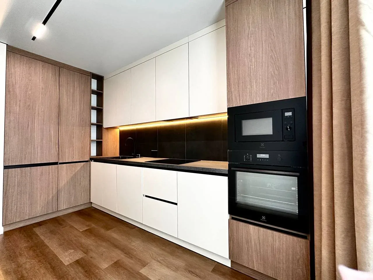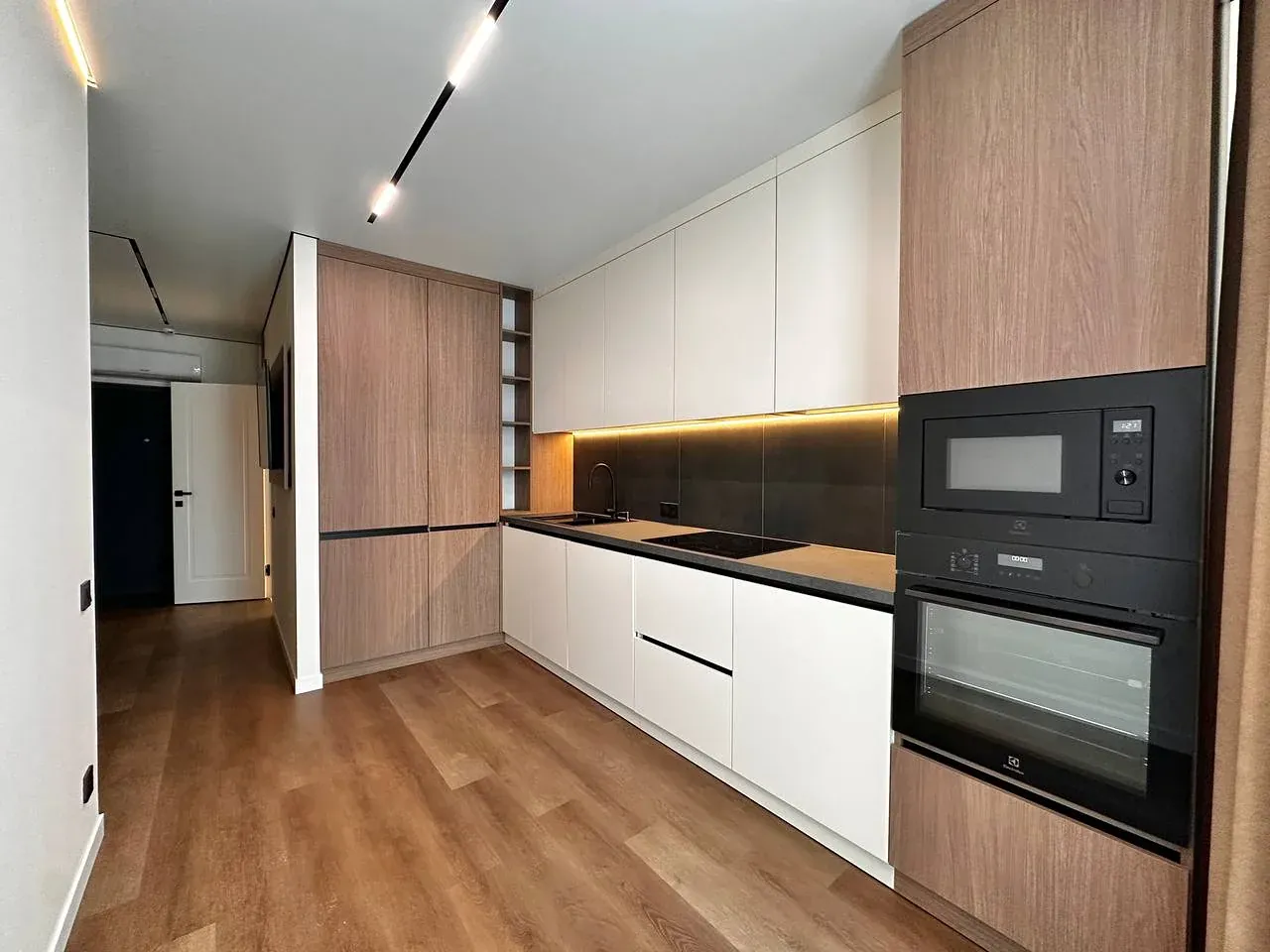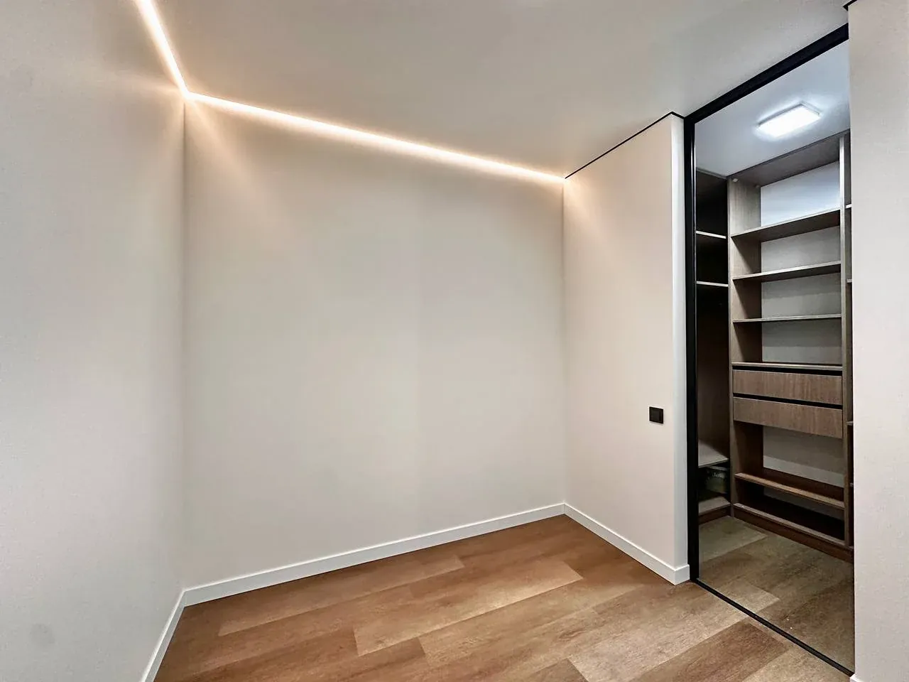 Встановлений гардероб із поличками. Підігрів підлоги по всій квартирі. Виконаний якісний дорогий ремонт. Підлогове покриття — кварц-вініл.