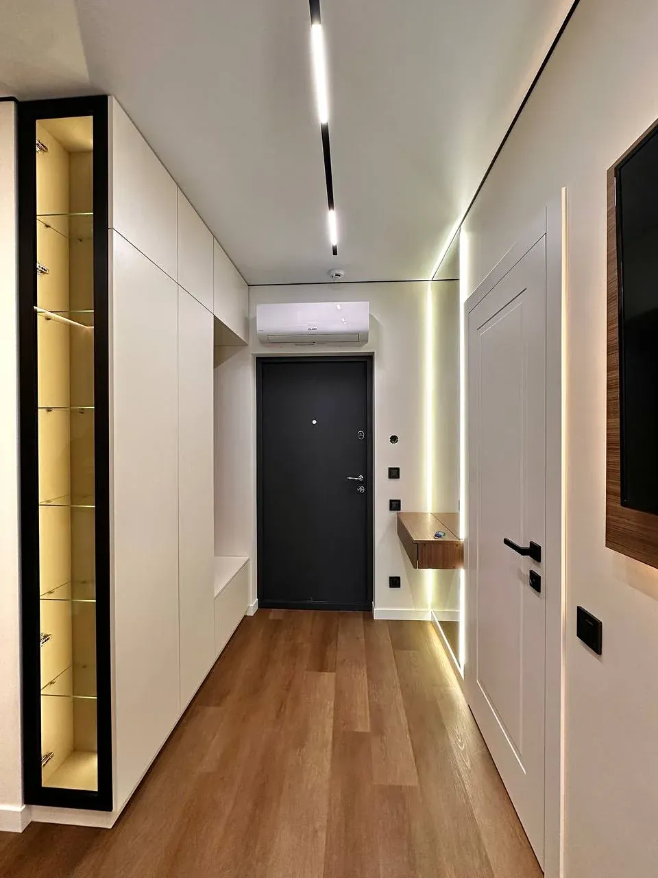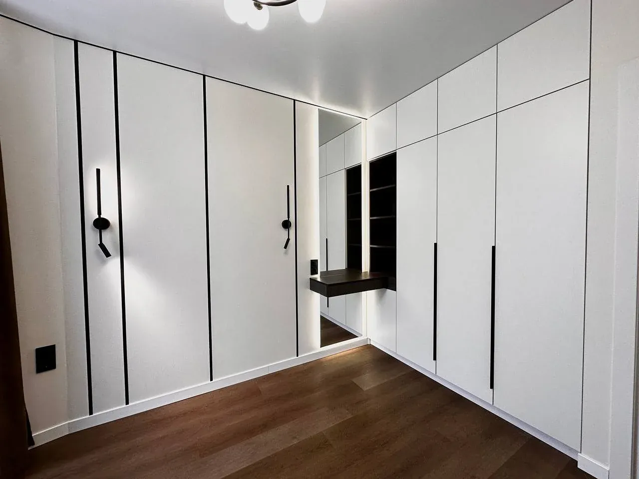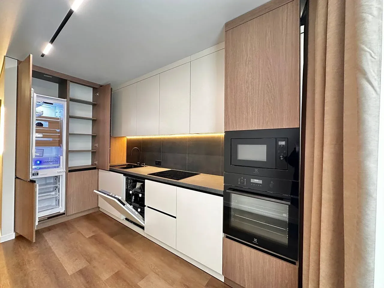 Встановлений гардероб із поличками. Підігрів підлоги по всій квартирі. Виконаний якісний дорогий ремонт. Підлогове покриття — кварц-вініл.