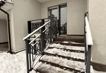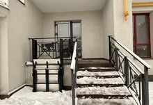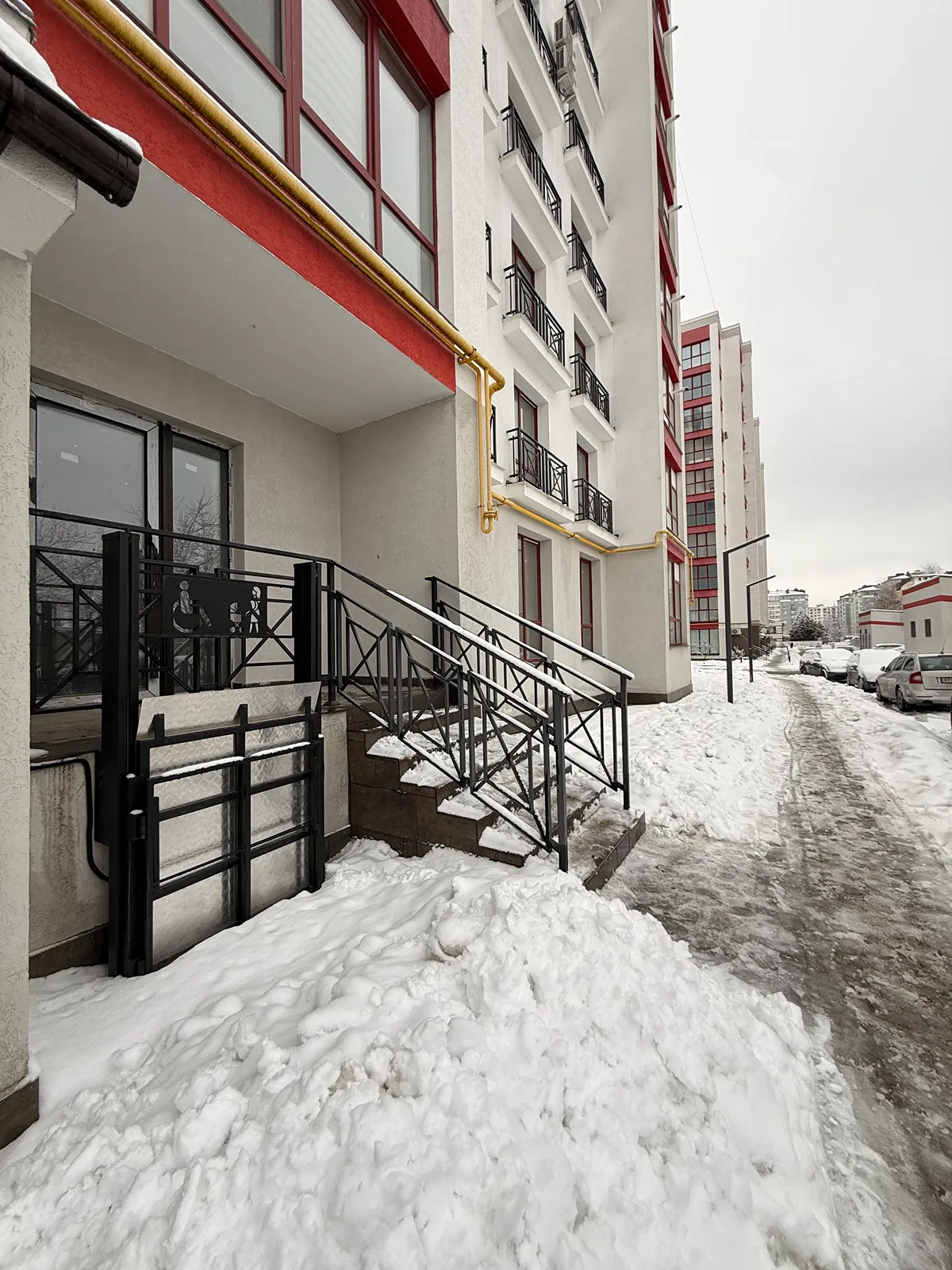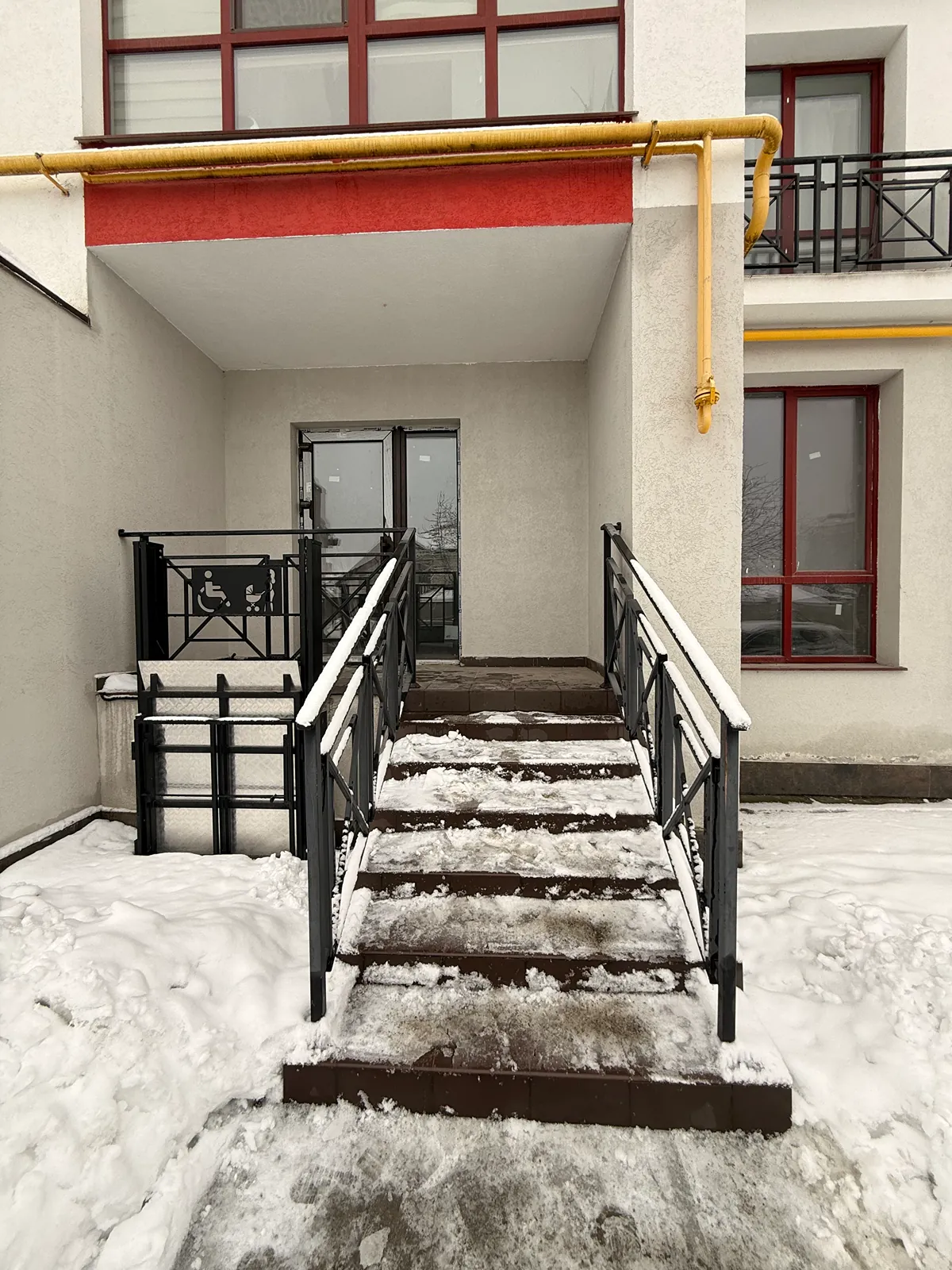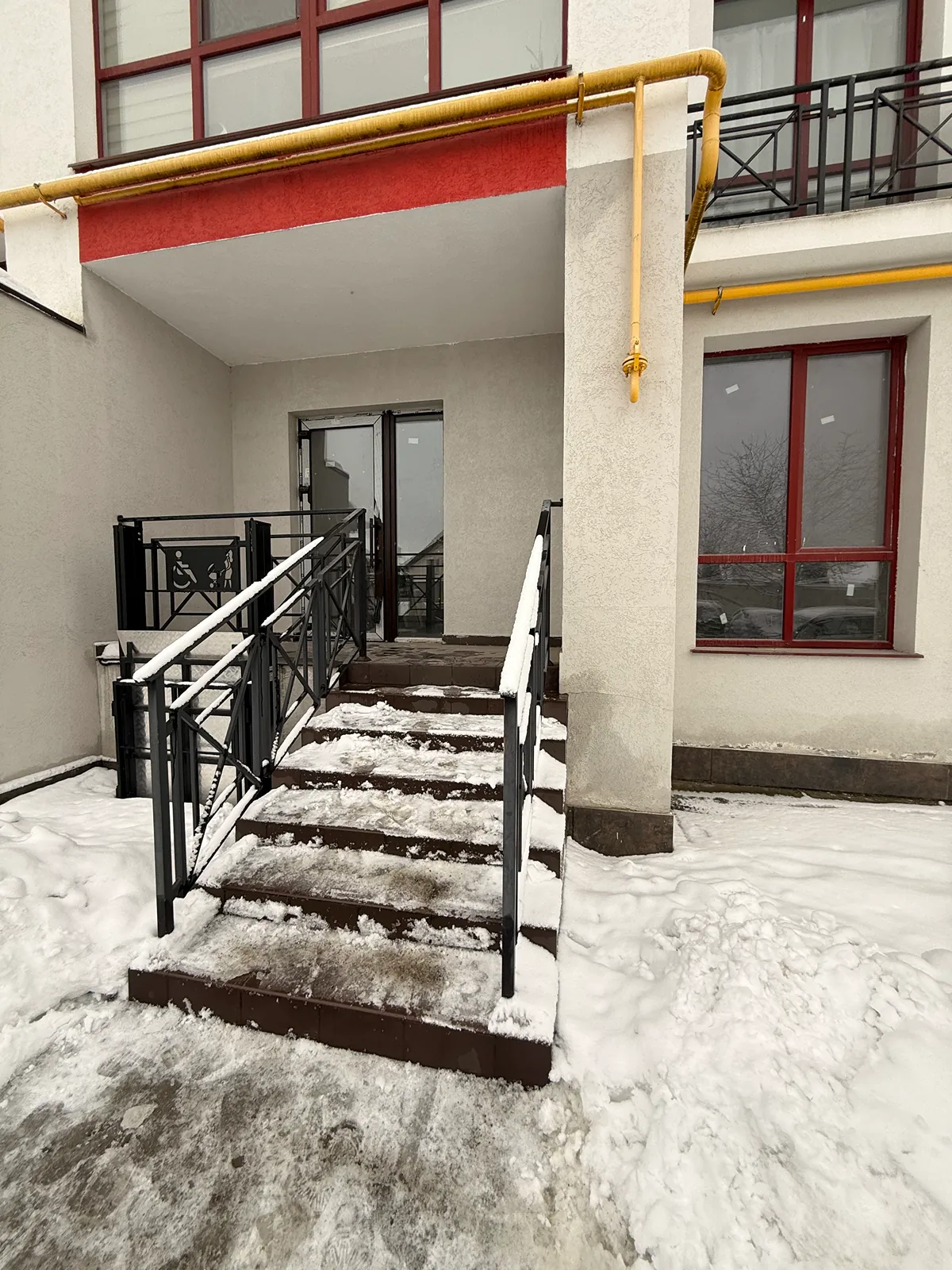 Фасадний вхід з панорамними вікнами та парадними сходами (забезпечено безбарʼєрний доступ для людей з інклюзивністю);