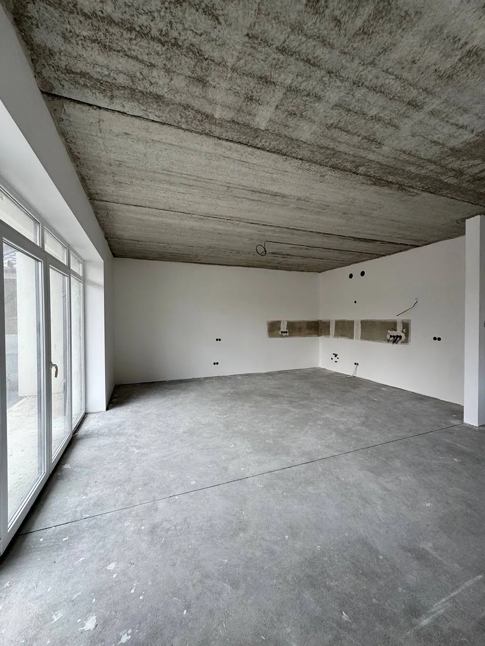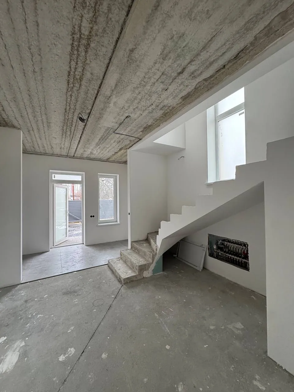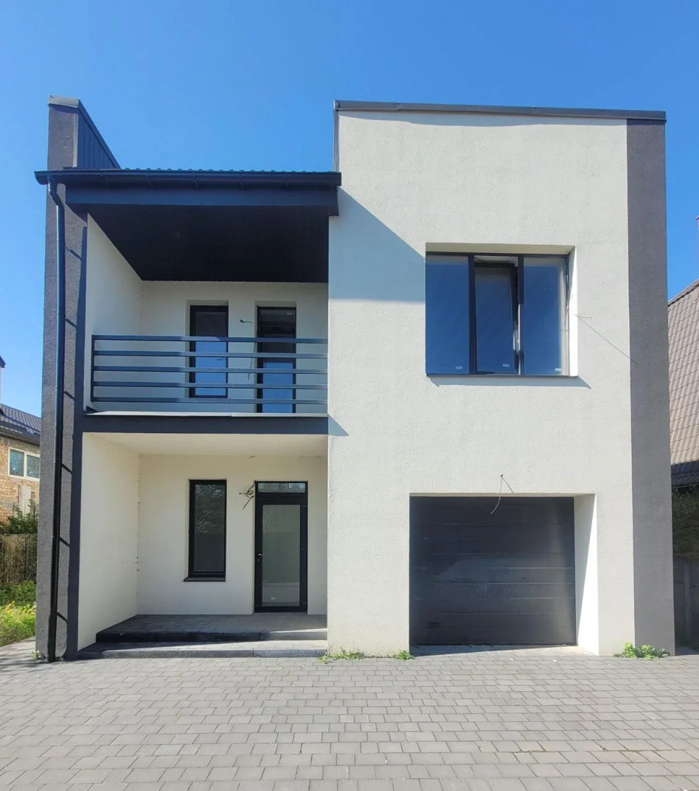 1-й поверх містить простору кухню-вітальню з виходом на терасу, окремий вхід в гараж на атомотичних воротах, гардеробну, санвузол, тех. приміщення.