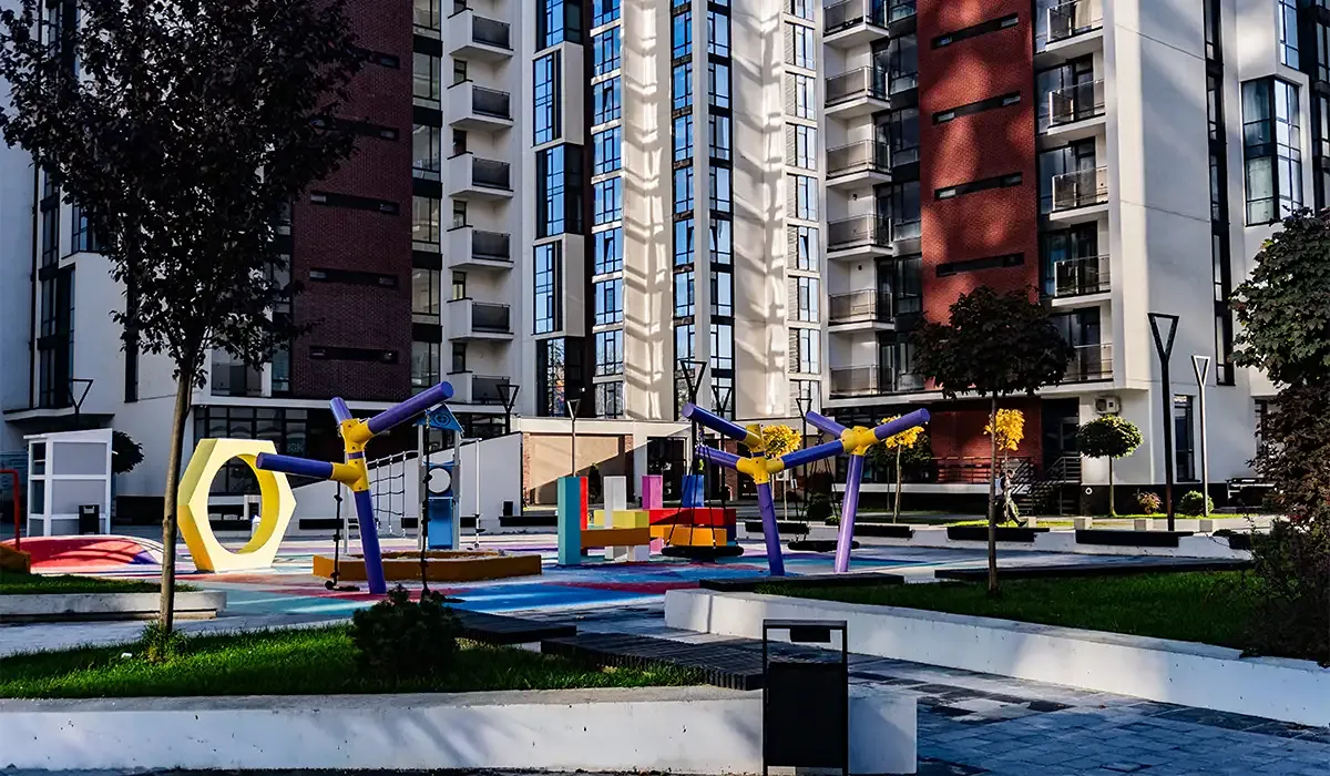 ЖК "Manhattan" з закритою територією, підземним паркінгом, просторим внутрішнім двором та власною інфраструктурою на території комплексу.