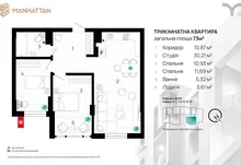 - Квартира гарного планування, заг. площею 73м2: дві окремі кімнати, лоджія в спальні, простора кухня-вітальня 30.2м2 , при вході ніша під гардеробну.