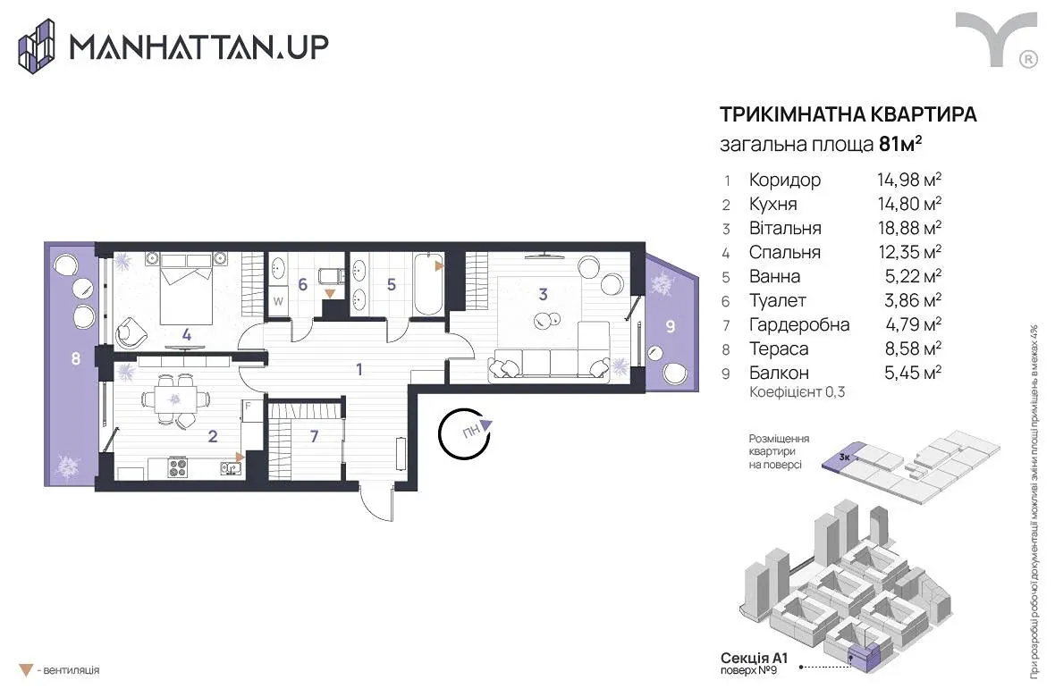 - Загальна площа - 76 м2, квартира роздільного планування, двостороння, кухня з виходом на терасу, балкон з кімнати з видом в внутрішній двір, два санвузли, гардеробна.