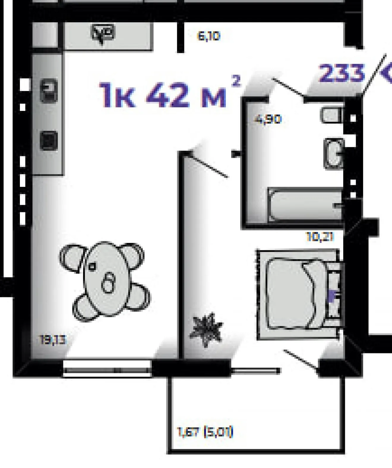 Велика кухня 19 м² з зоною вітальні, зі спальні є вихід на відкритий балкон — ідеальний простір для ранкової кави.
