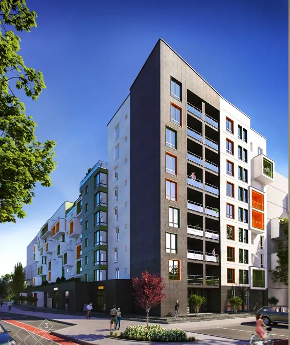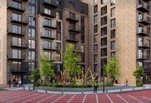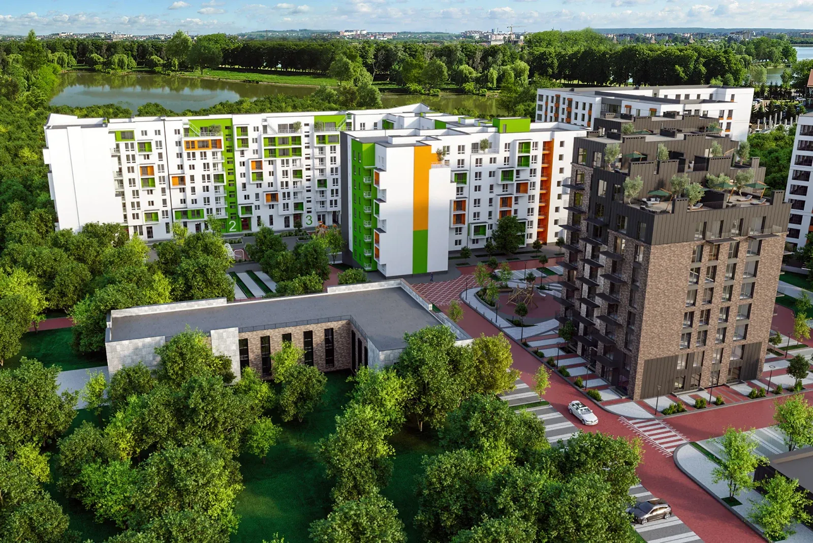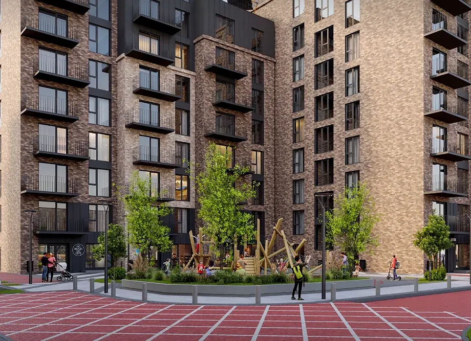 Житловий комплекс з дитячими та спортивними майданчиками, стильним ландшафтним дизайном та відпочинковими зонами за концепцією "двір без авто".