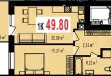 Зручне сучасне планування: простора кухня-вітальня 21 м.кв. з виходом на балкон, і окрема затишна спальня.