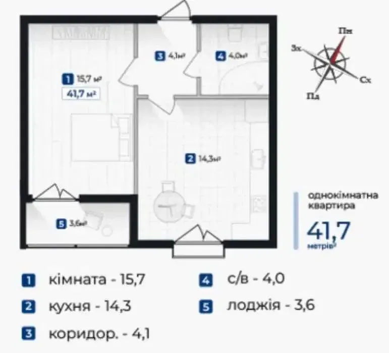 - затишна спальня 15.7м2 з лоджією 3.7м2 де можна організувати робочу, відпочинкову чи бʼюті зону з панорамними вікнами.