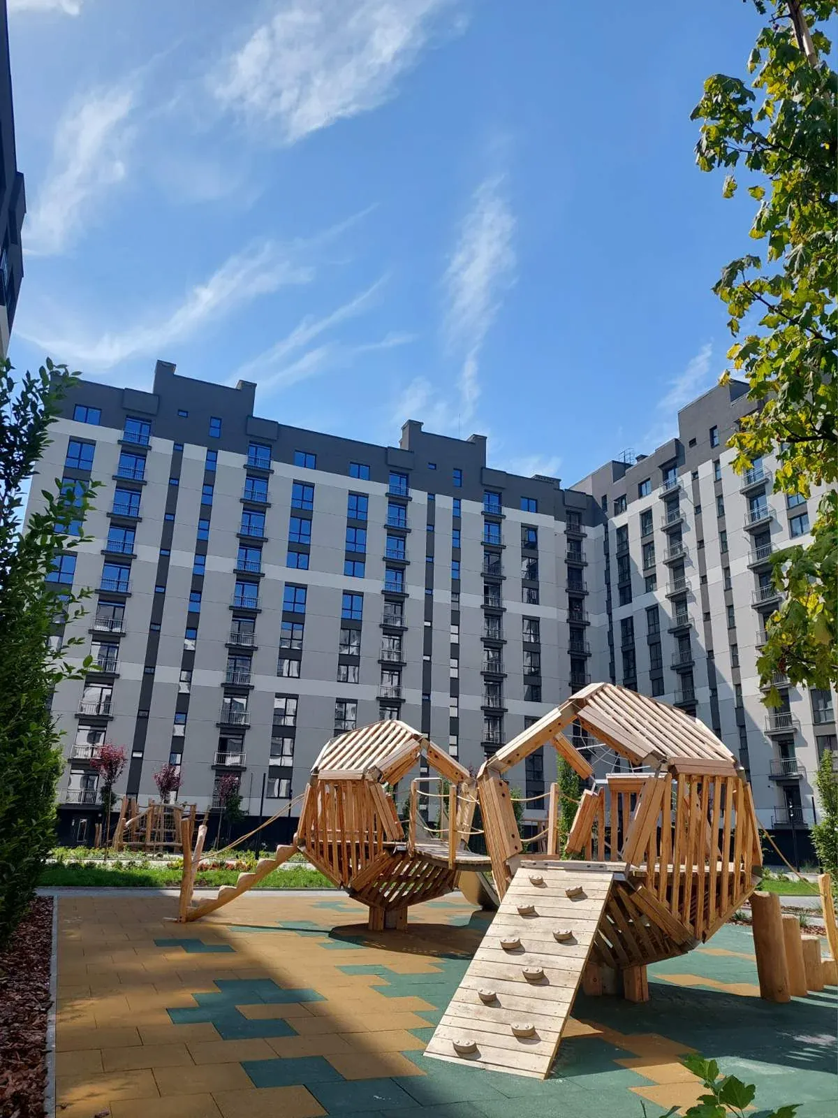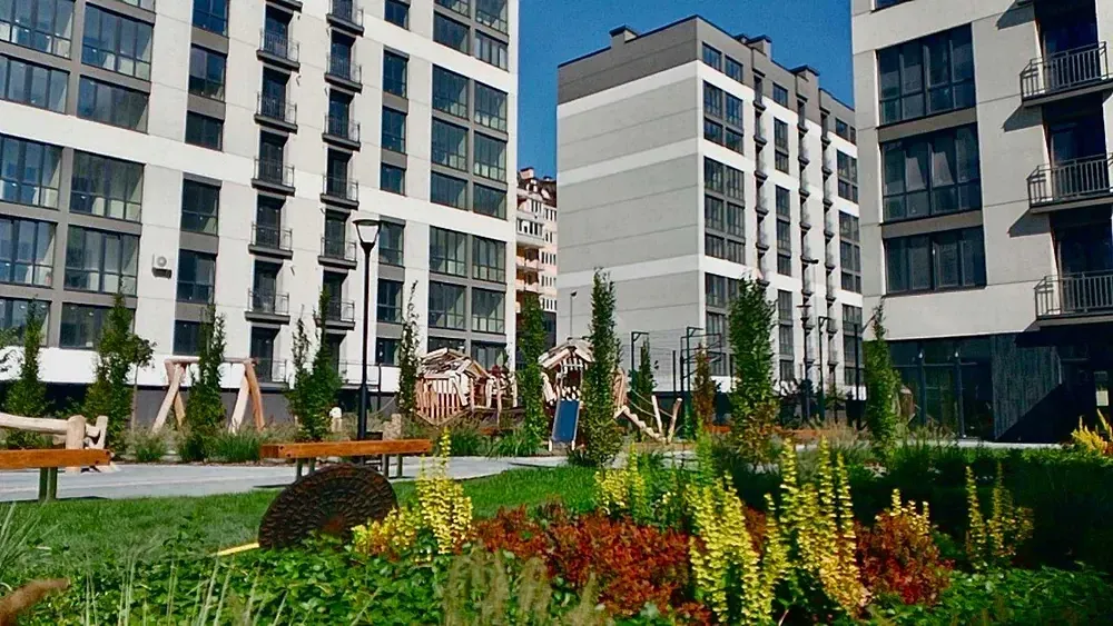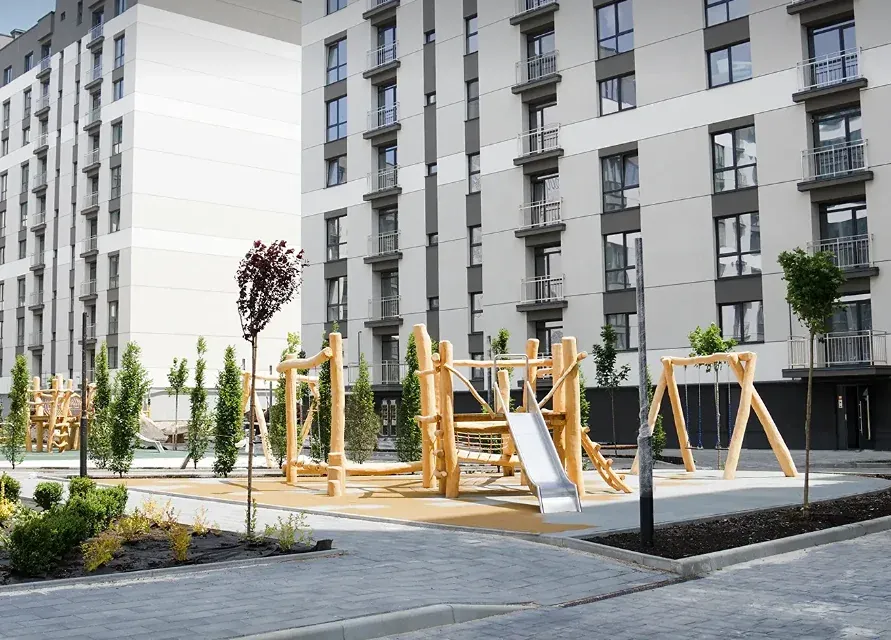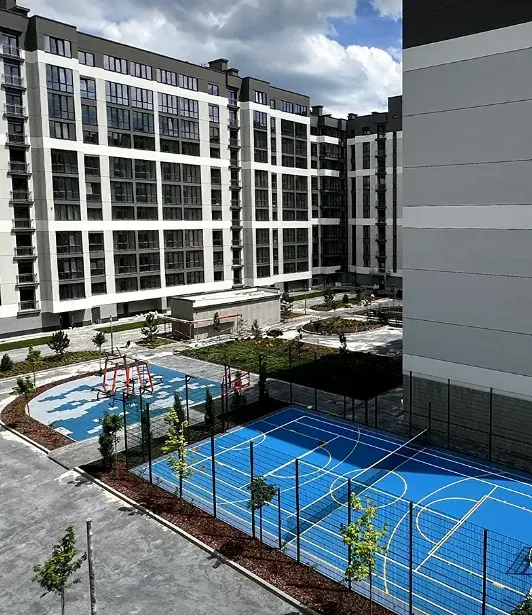 Затишний Житловий Комплекс закритого типу з дитячими та спортивними майданчиками, відпочинковими зонами, стильним ландшафтним дизайном з великою кількістю зелених насаджень.