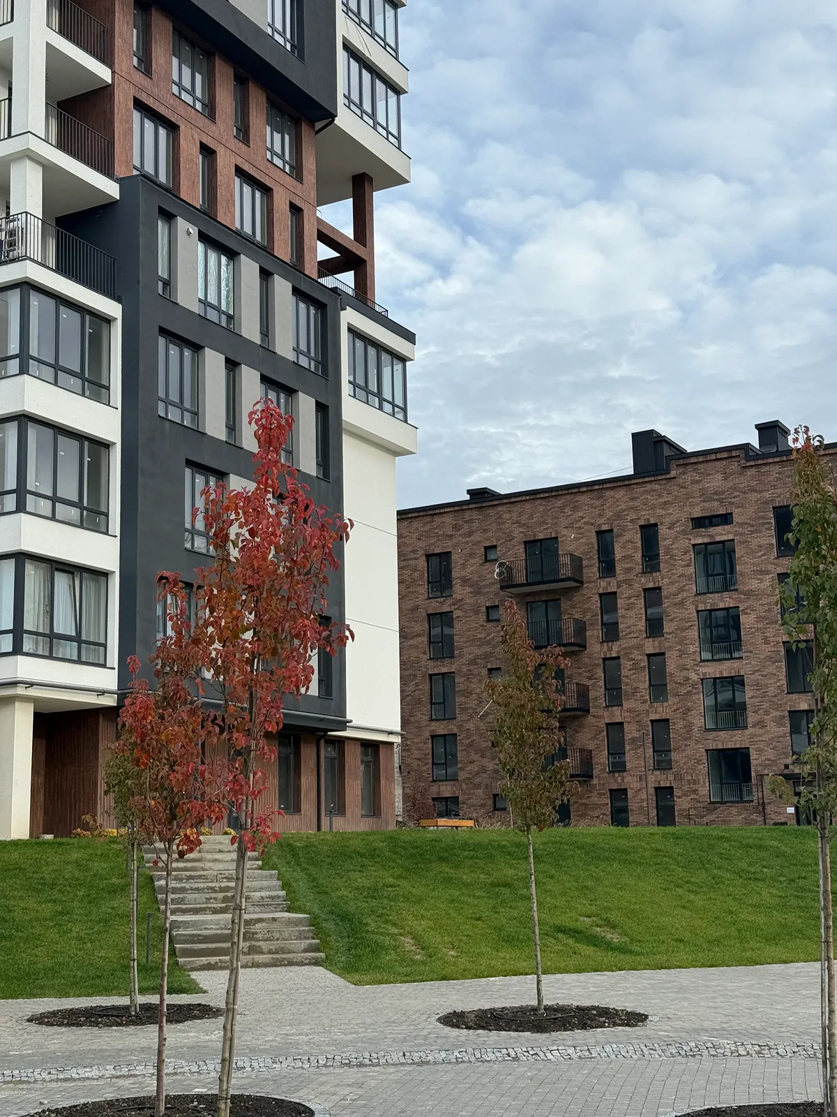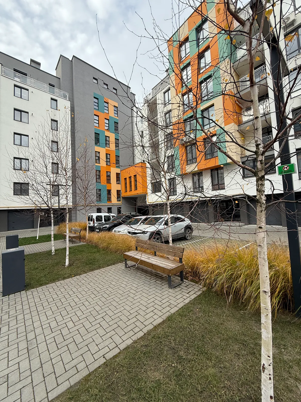 Комплекс закритого типу, двір вільний від авто з ландшафтним дизайном, відпочинковими зонами, дитячим та великим спортивним майданчиком.