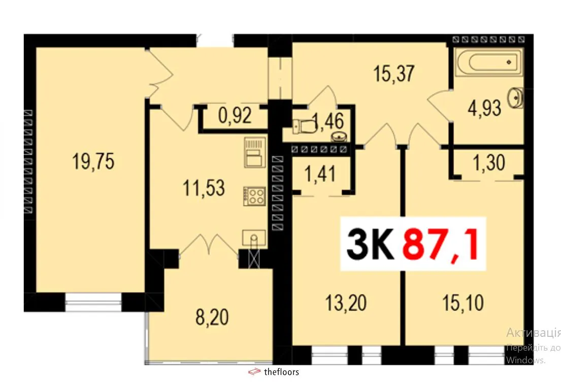 - Квартира функціонального планування з окремими трьома кімнатами, кухня з просторим балконом (терасою) 8.2 м2.