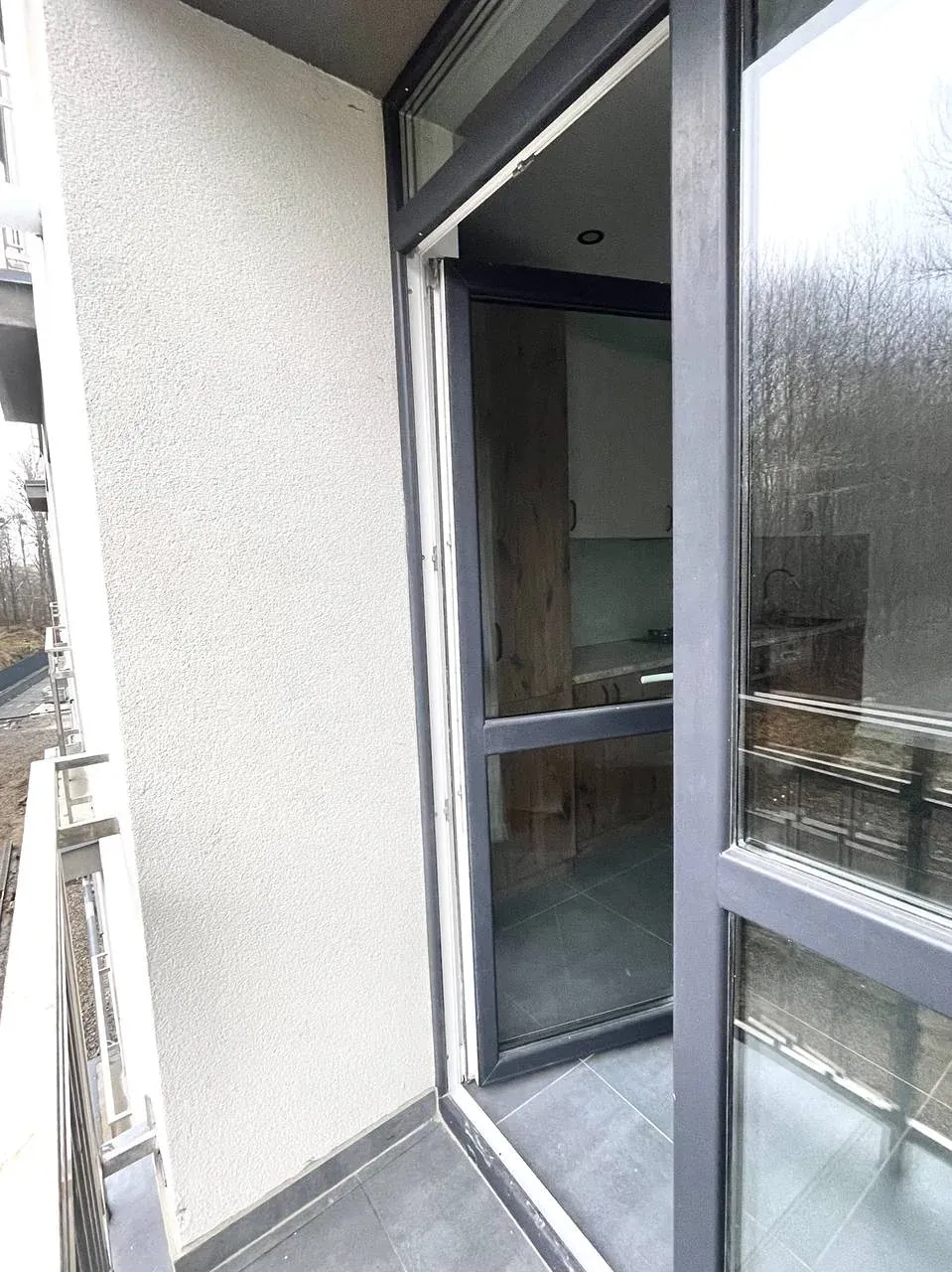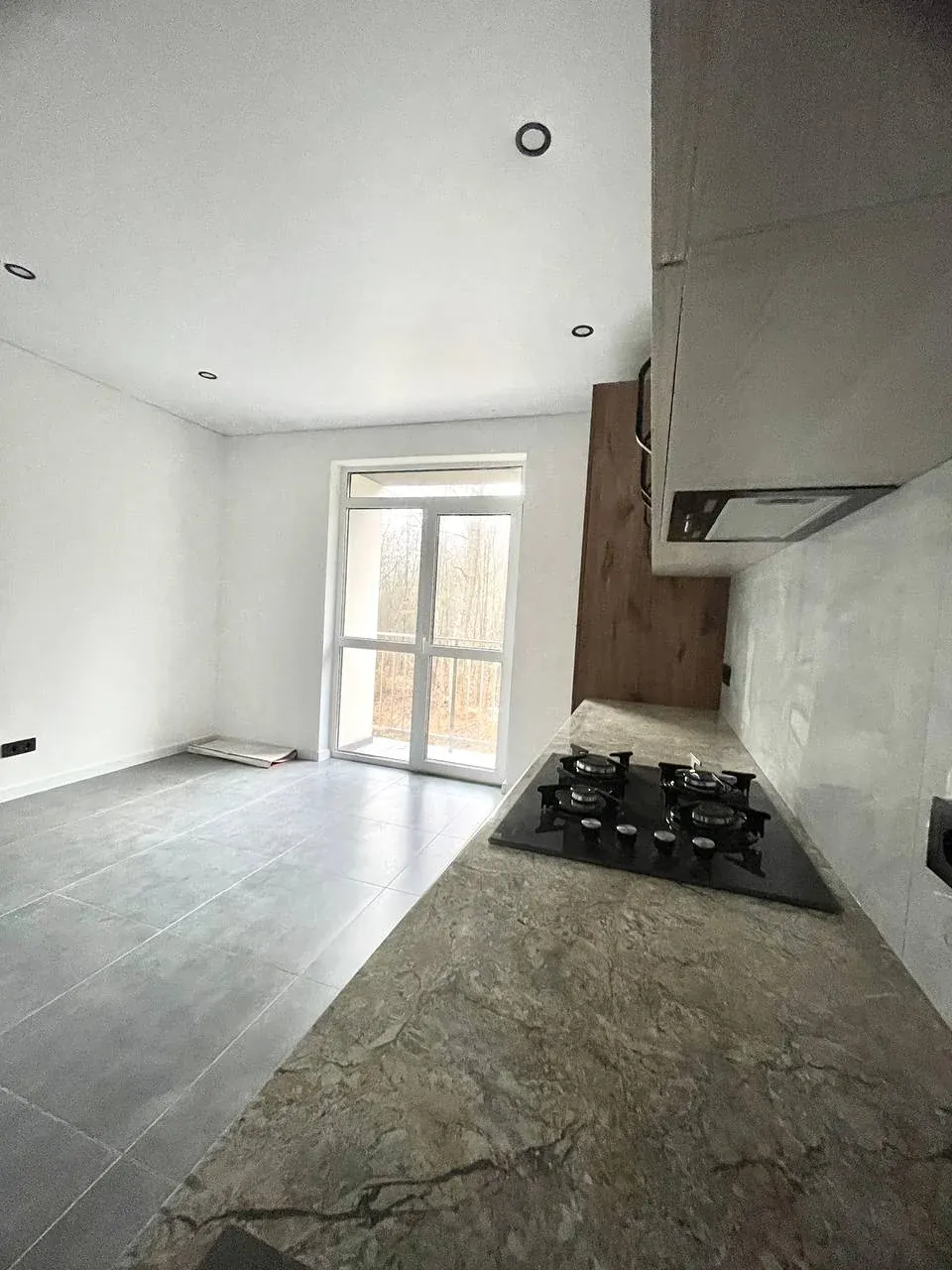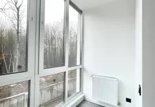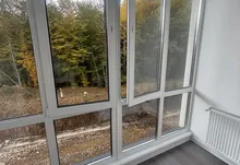 Простора кімната з великим вікном, лоджією та видом на зелену зоною
