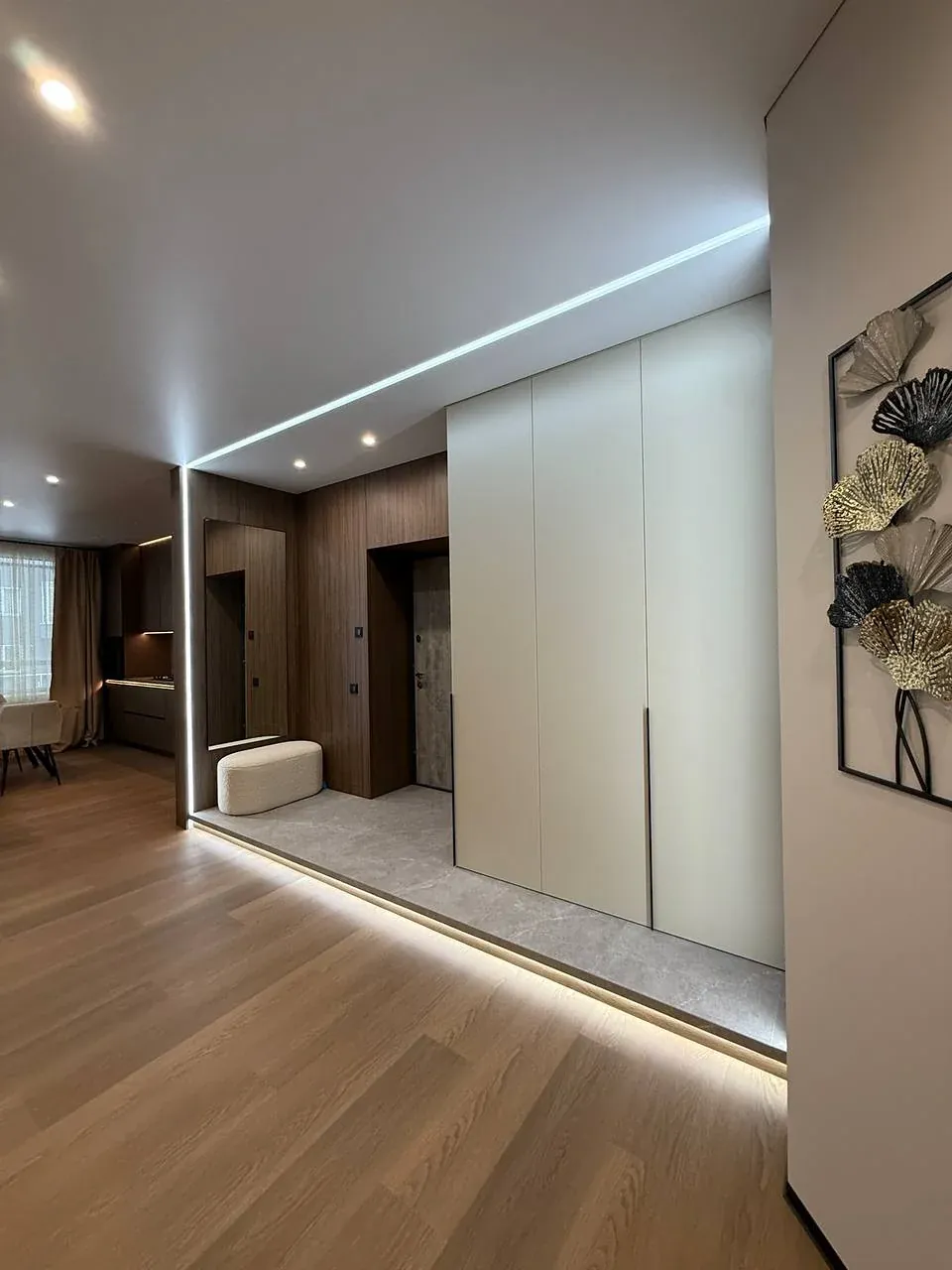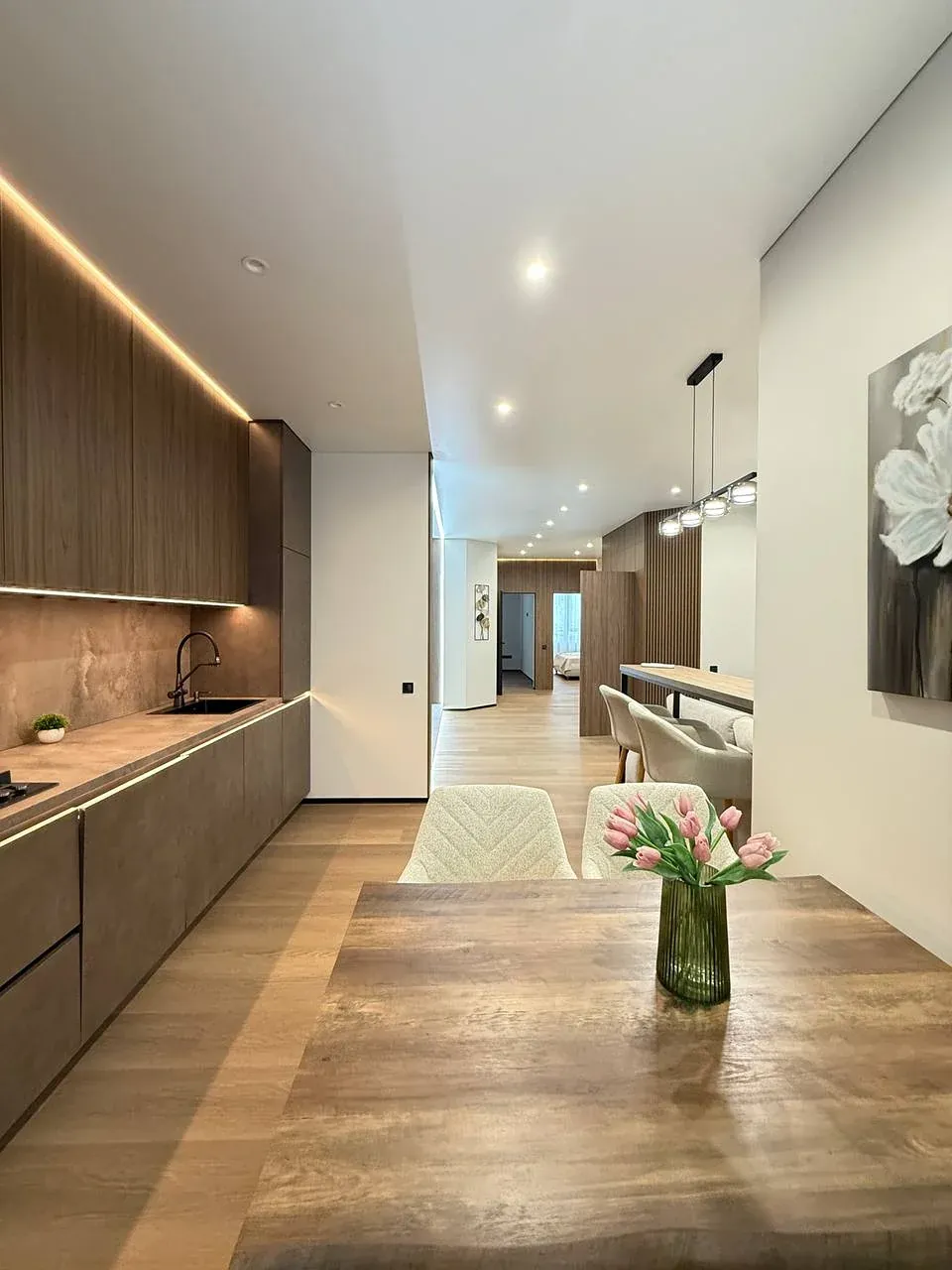 Інтерʼєр доповнюють алюмінієві плінтуси, двері прихованого монтажу, стильні сучасні рішення та якісна фурнітура.