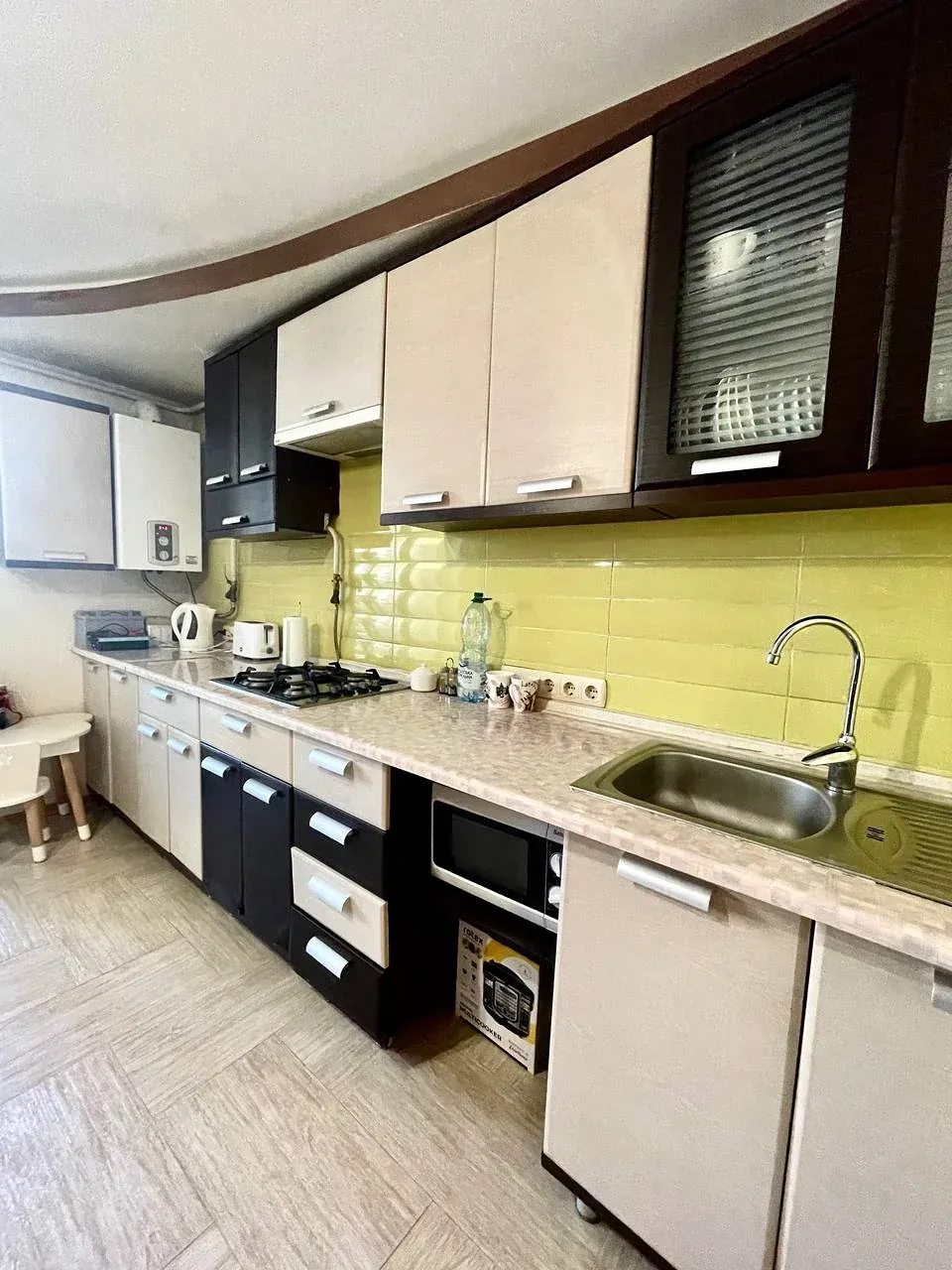 Побутова техніка: холодильник, варильна панель, плита, мікрохвильова піч, пральна машина.