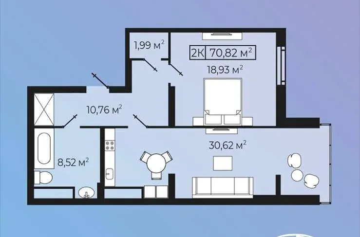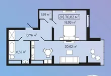 Квартира функціонального планування заг. площею - 71м2 з зонованою кухнею та просторою вітальнею 30,6м2, дві окремі гардеробні та велика ванна кімната 8 м2.