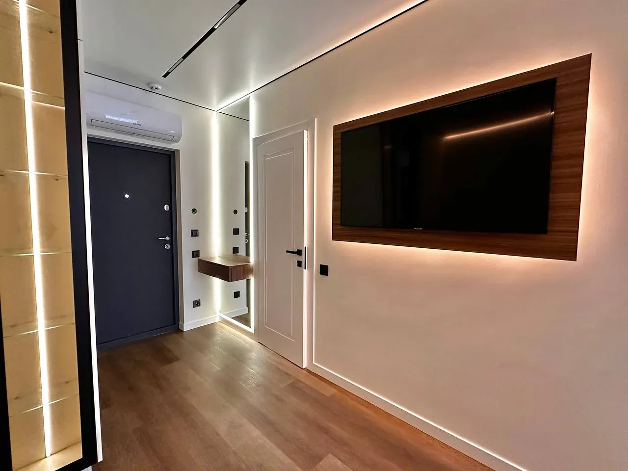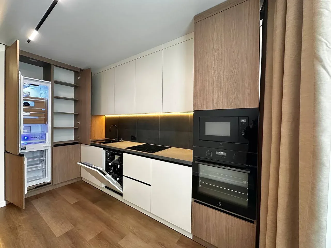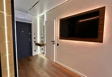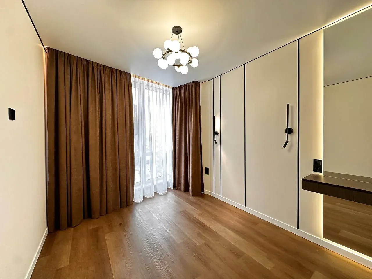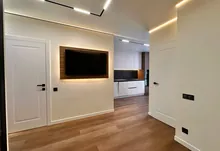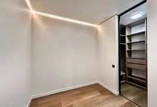 Встановлений гардероб із поличками. Підігрів підлоги по всій квартирі. Виконаний якісний дорогий ремонт. Підлогове покриття — кварц-вініл.
