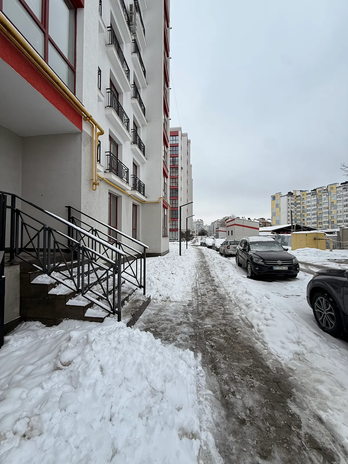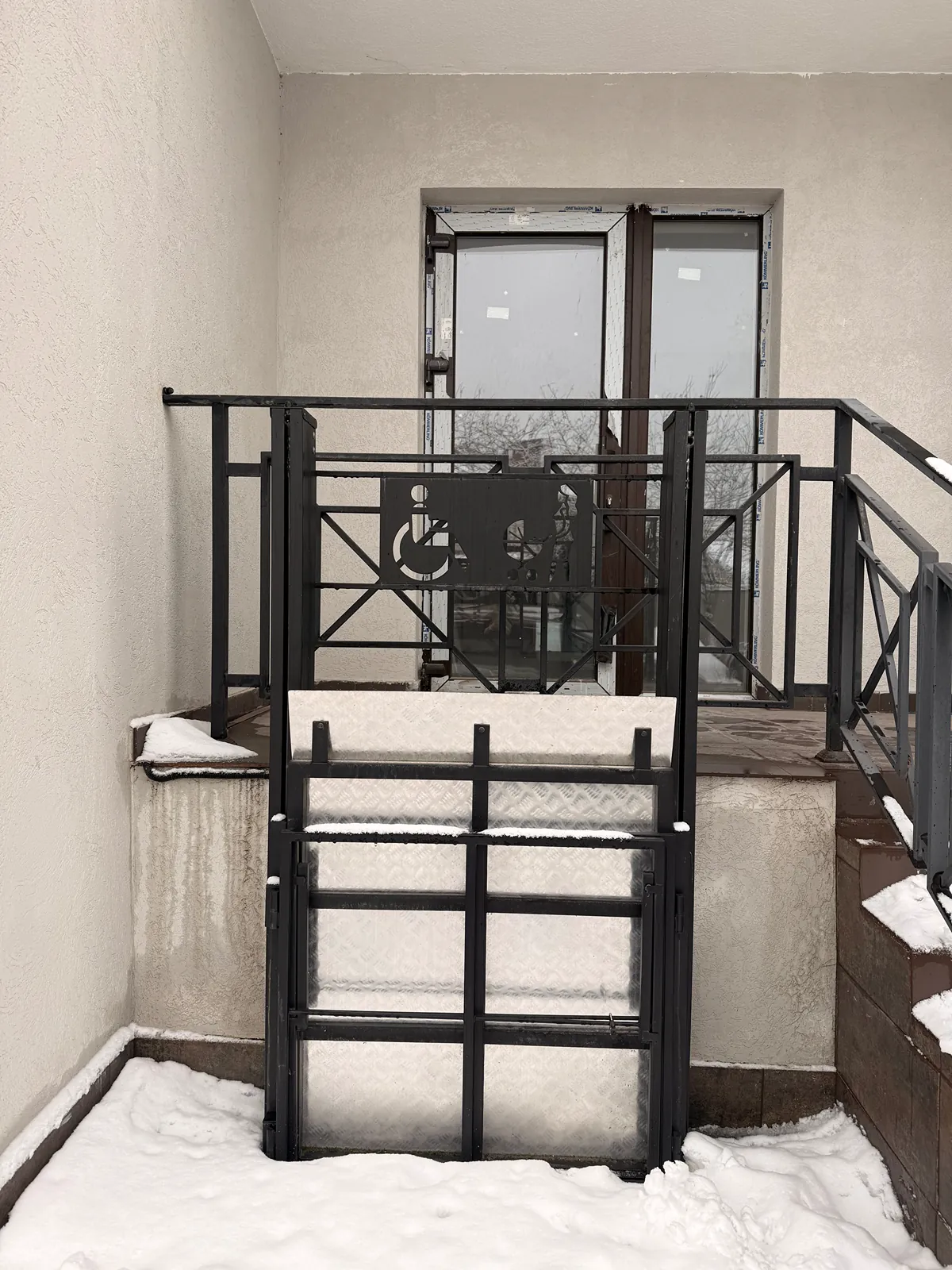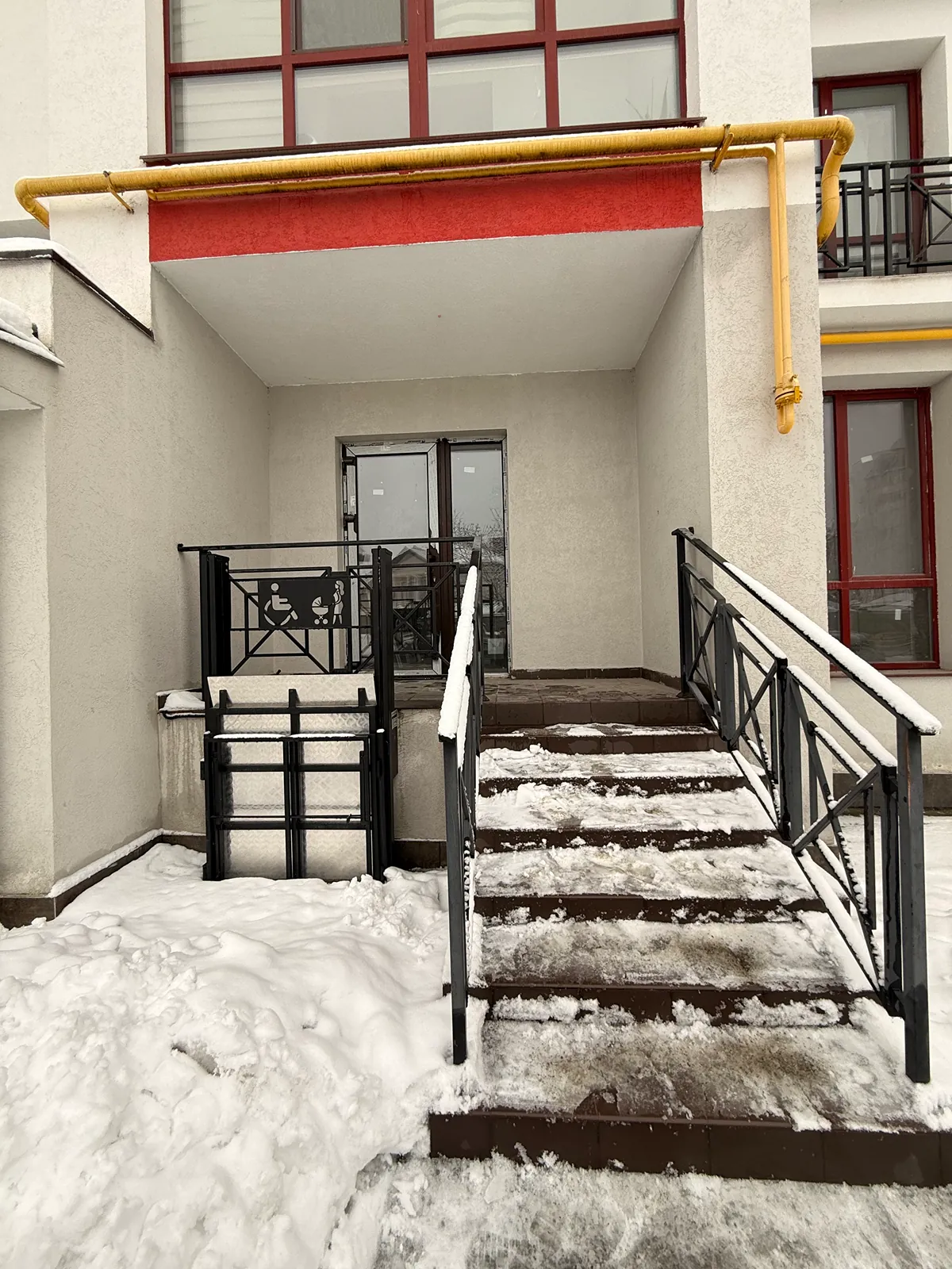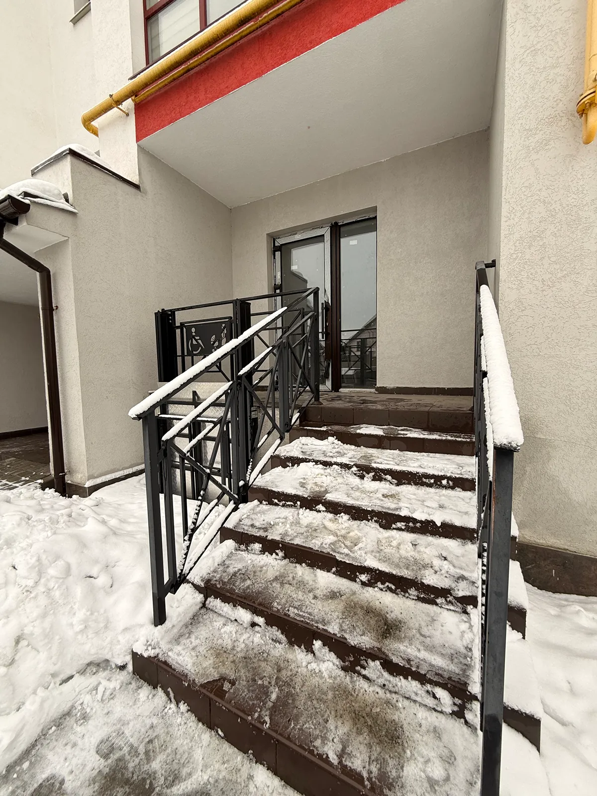 Фасадний вхід з панорамними вікнами та парадними сходами (забезпечено безбарʼєрний доступ для людей з інклюзивністю);