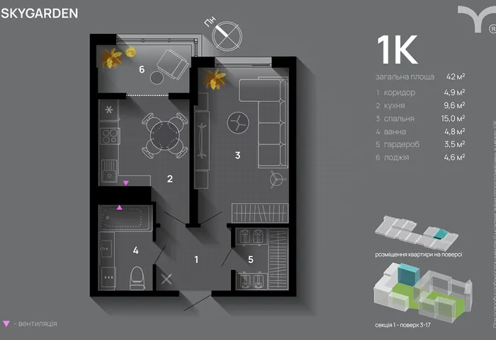 1-кімнатна квартира в ЖК Скандинавія, секція на здачі